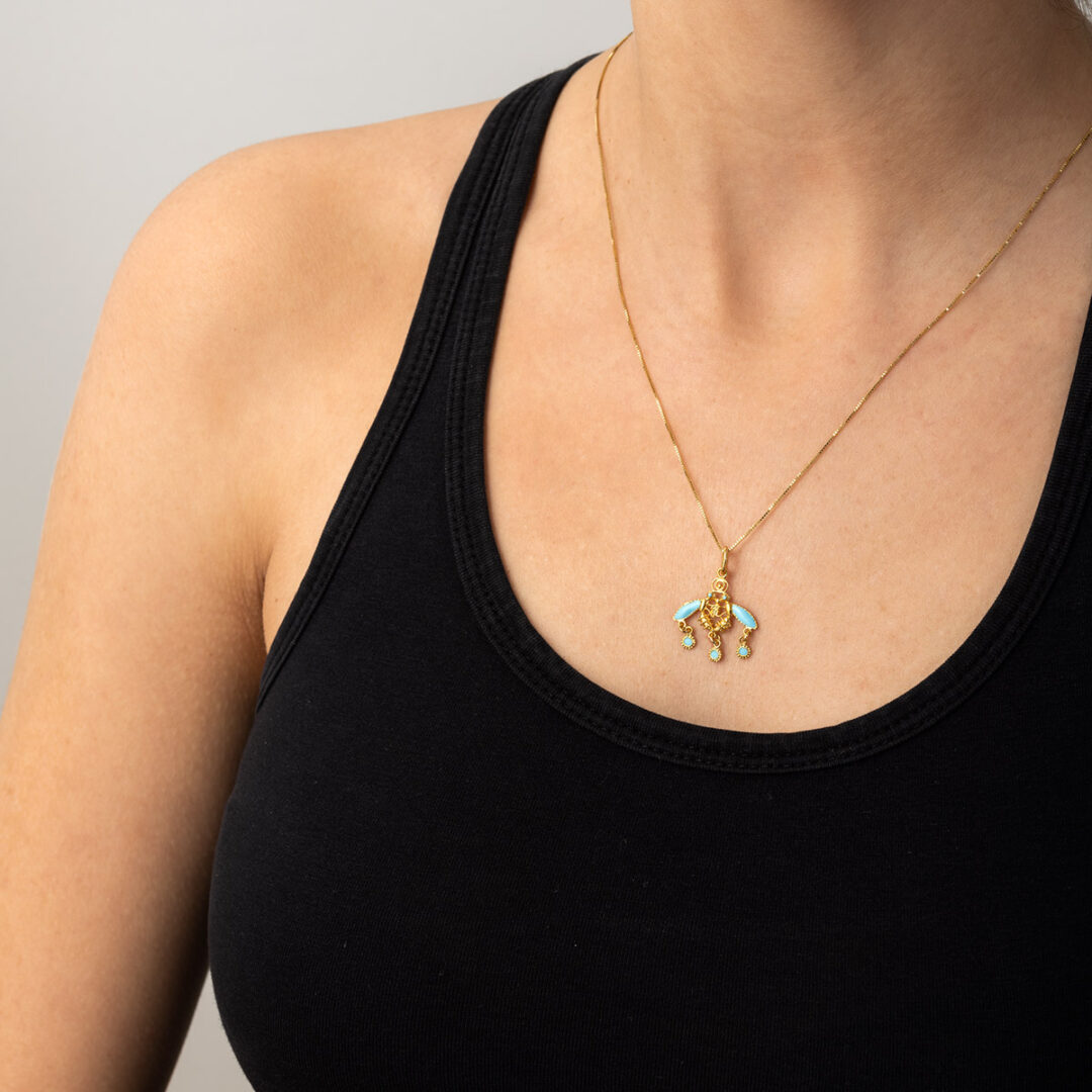 The pendant shown is our 18k Yellow Gold Minoan Bee Pendant (not included).
