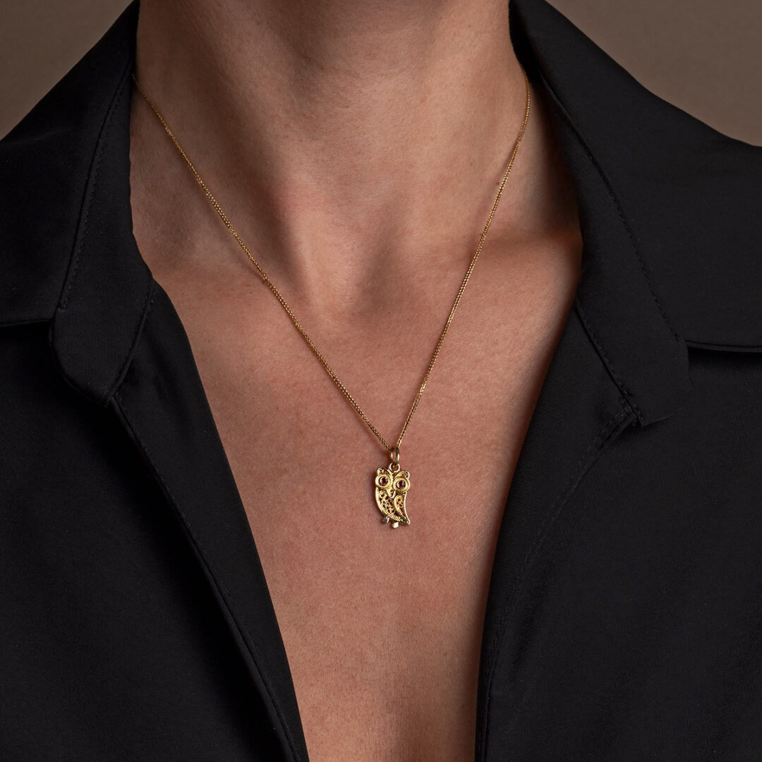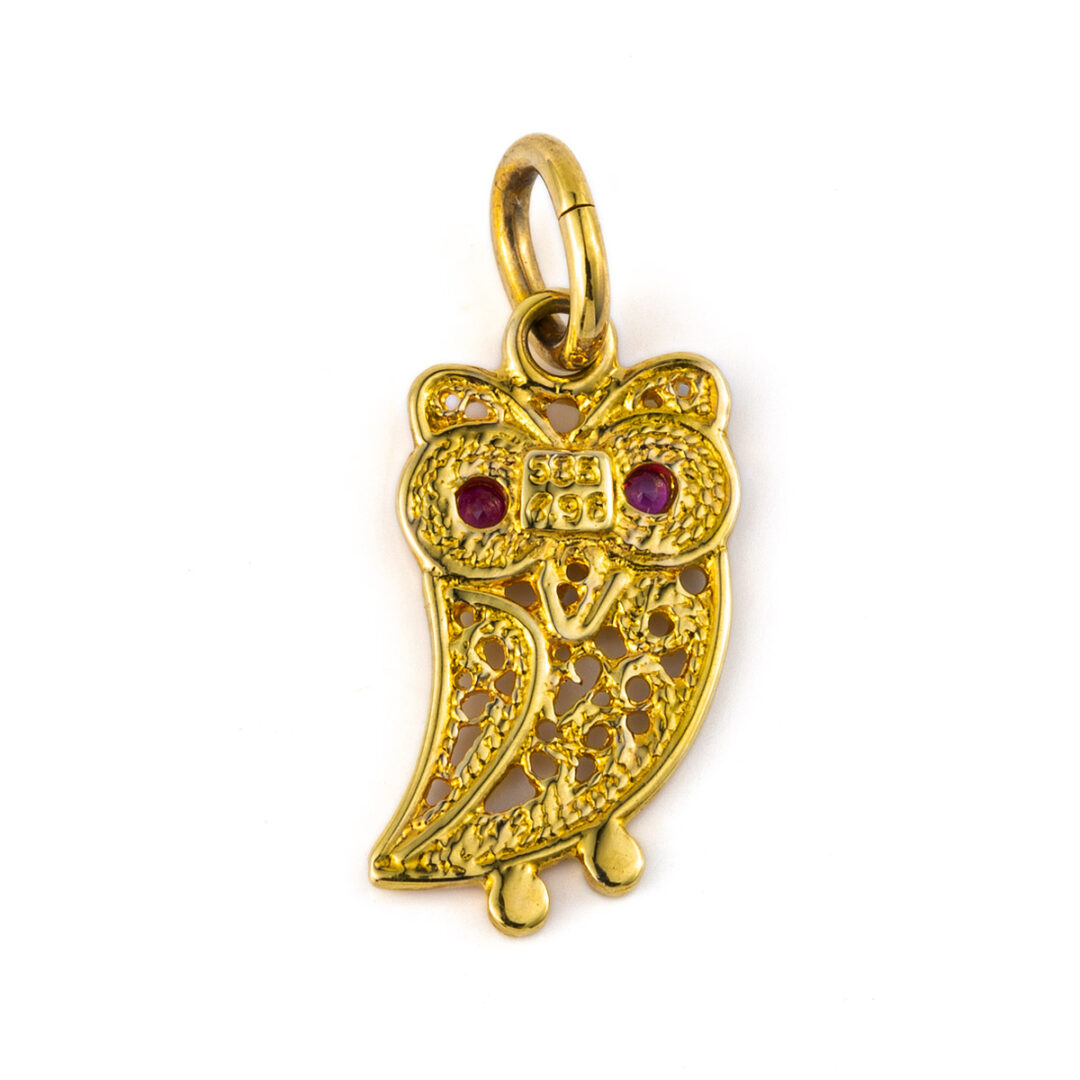 Wisdom Owl Pendant embellished with a fine filigree and the owl eyes are decorated with a ruby gemstone