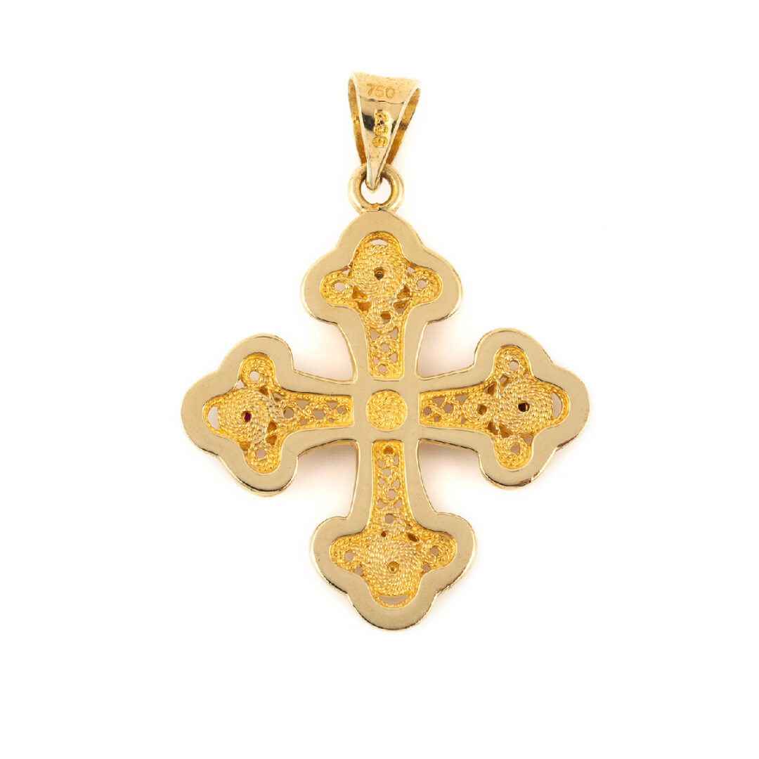 18k Gold Byzantine Cross with multi precious stones rubies emeralds and sapphires.