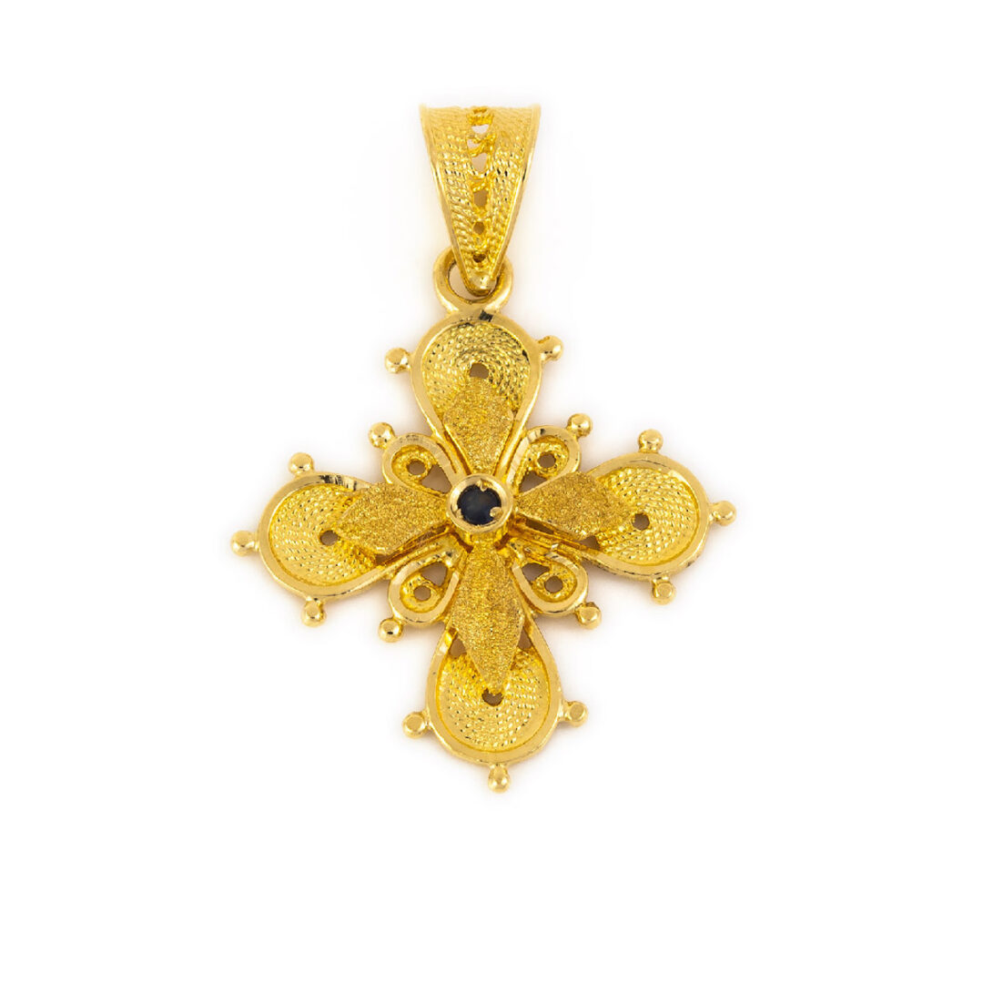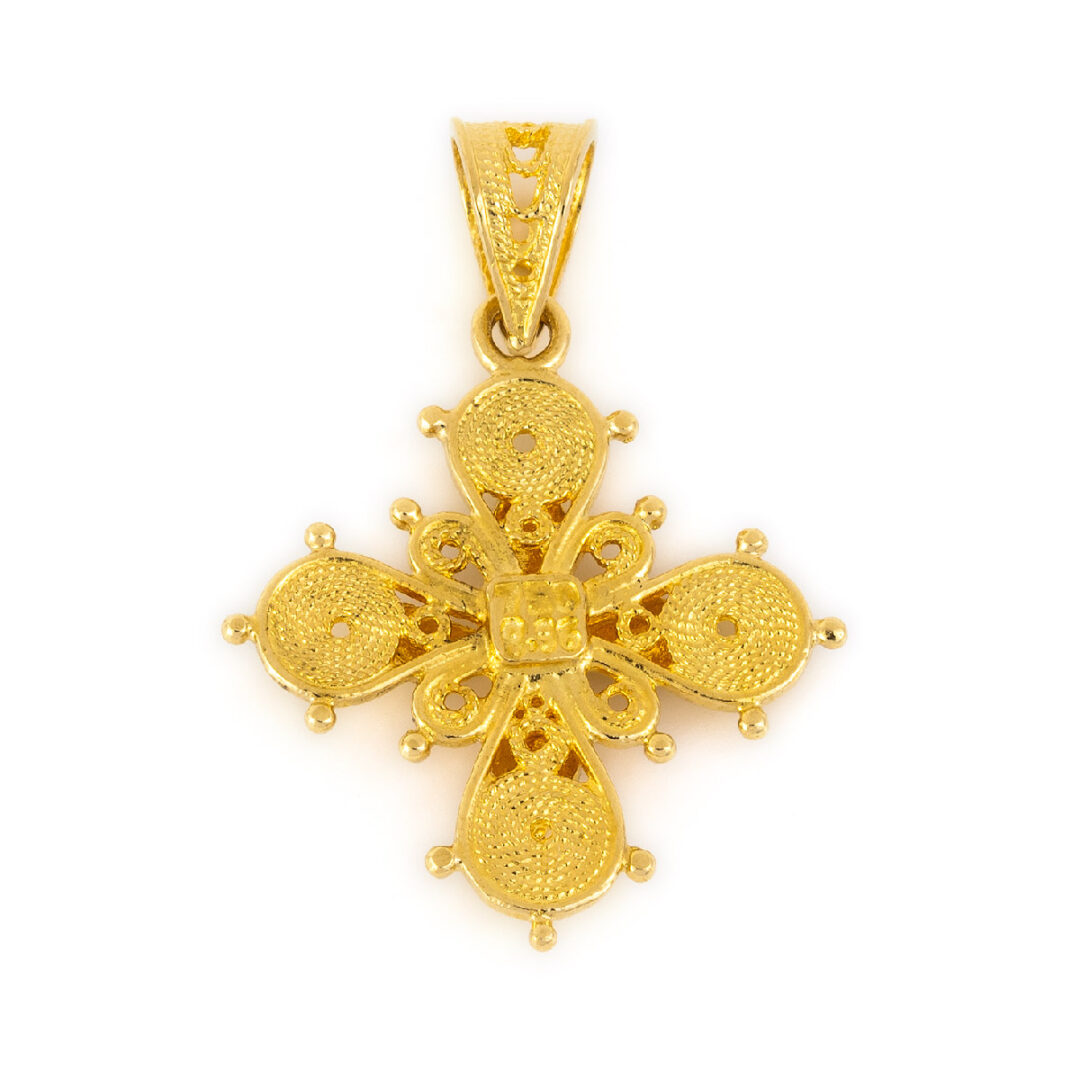 Byzantine Cross embellished with a fine filigree, an emerald gemstone in the middle and granules of precious metal.