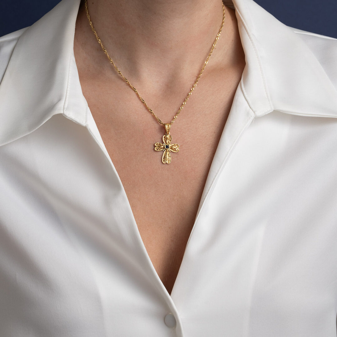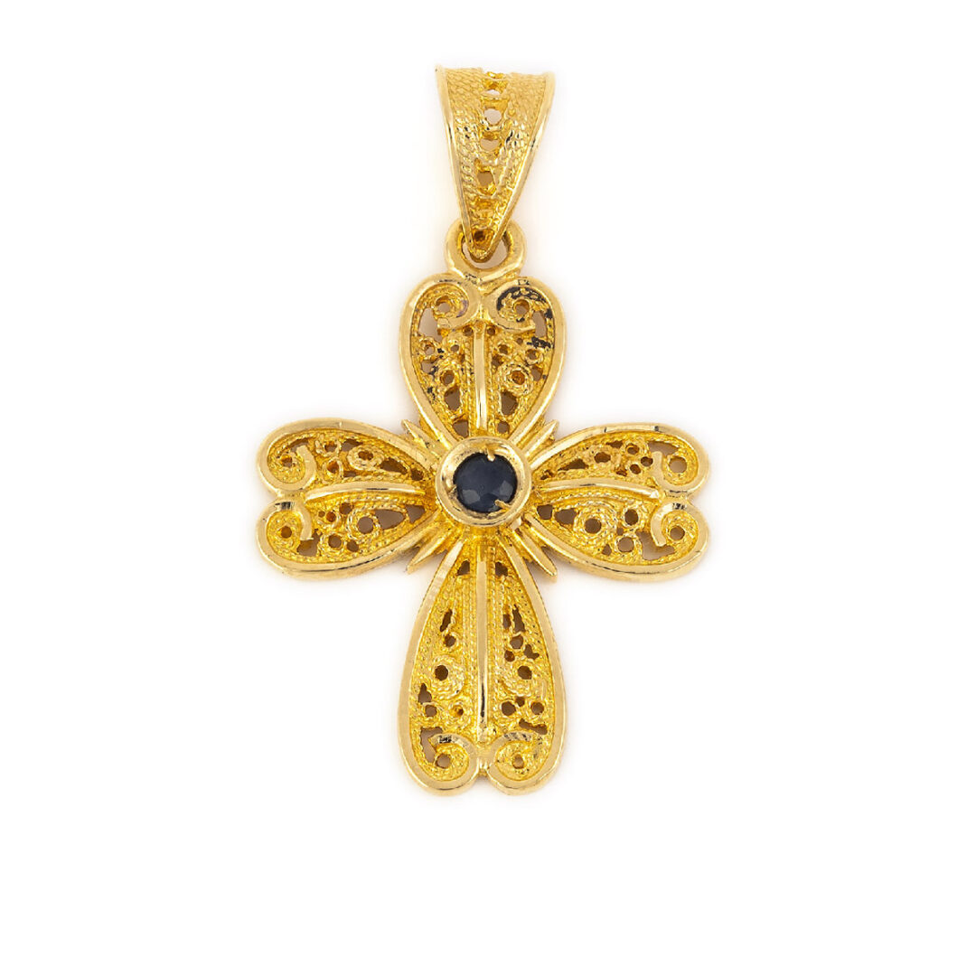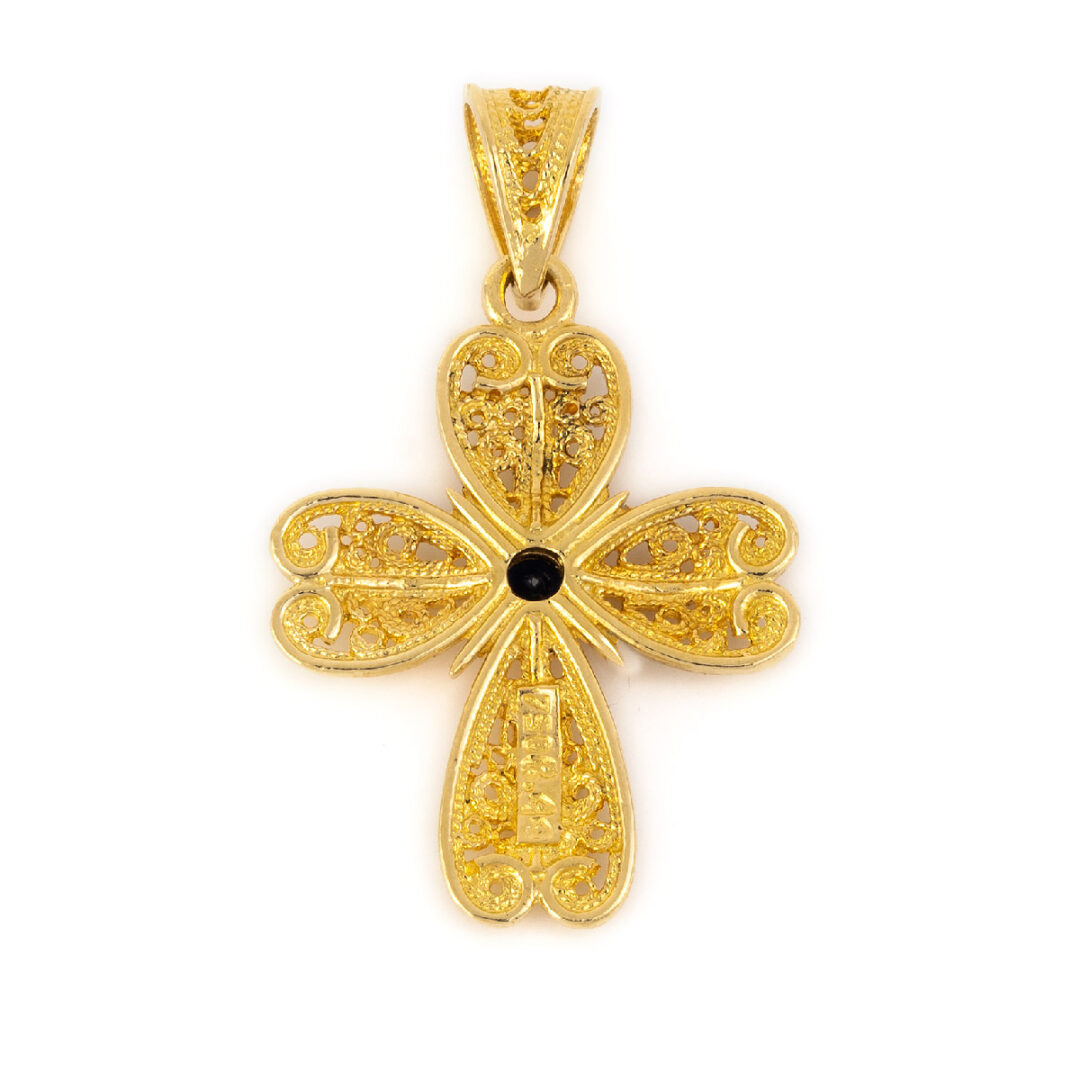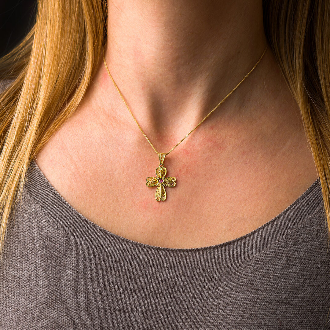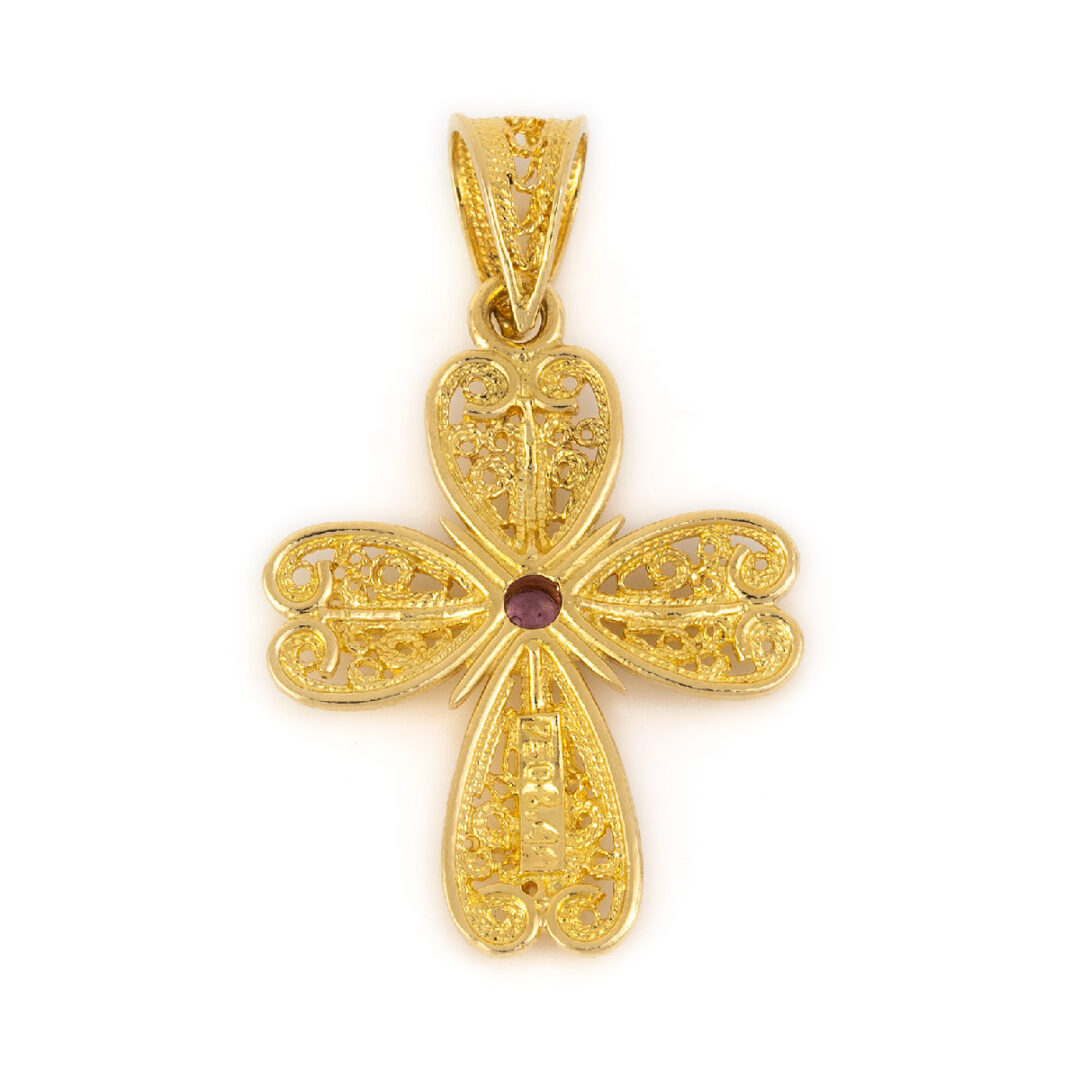 Byzantine Cross embellished with a fine filigree and a ruby gemstone in the middle.