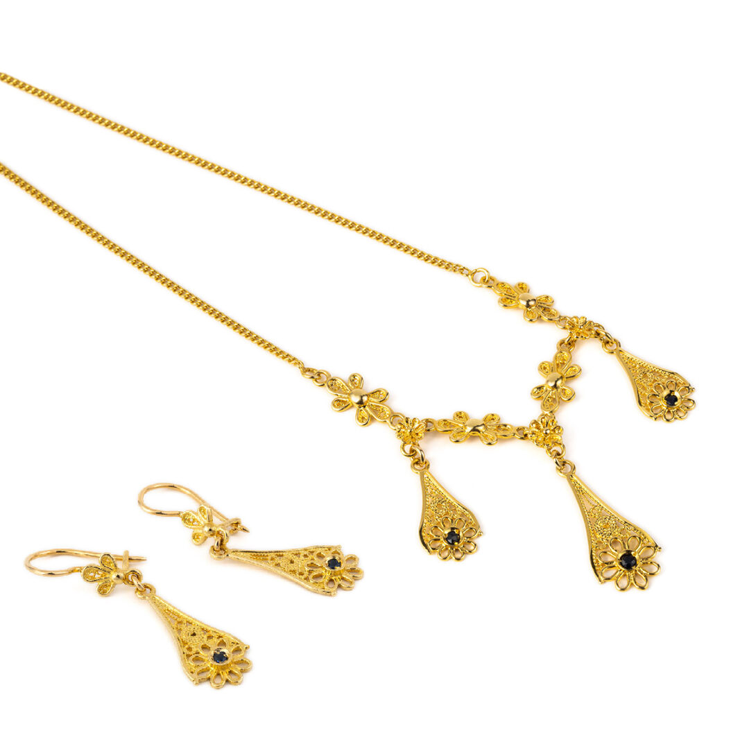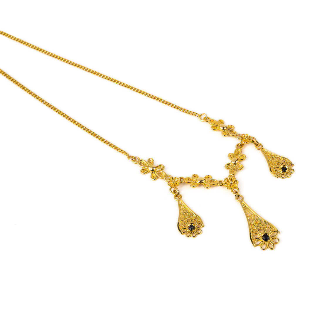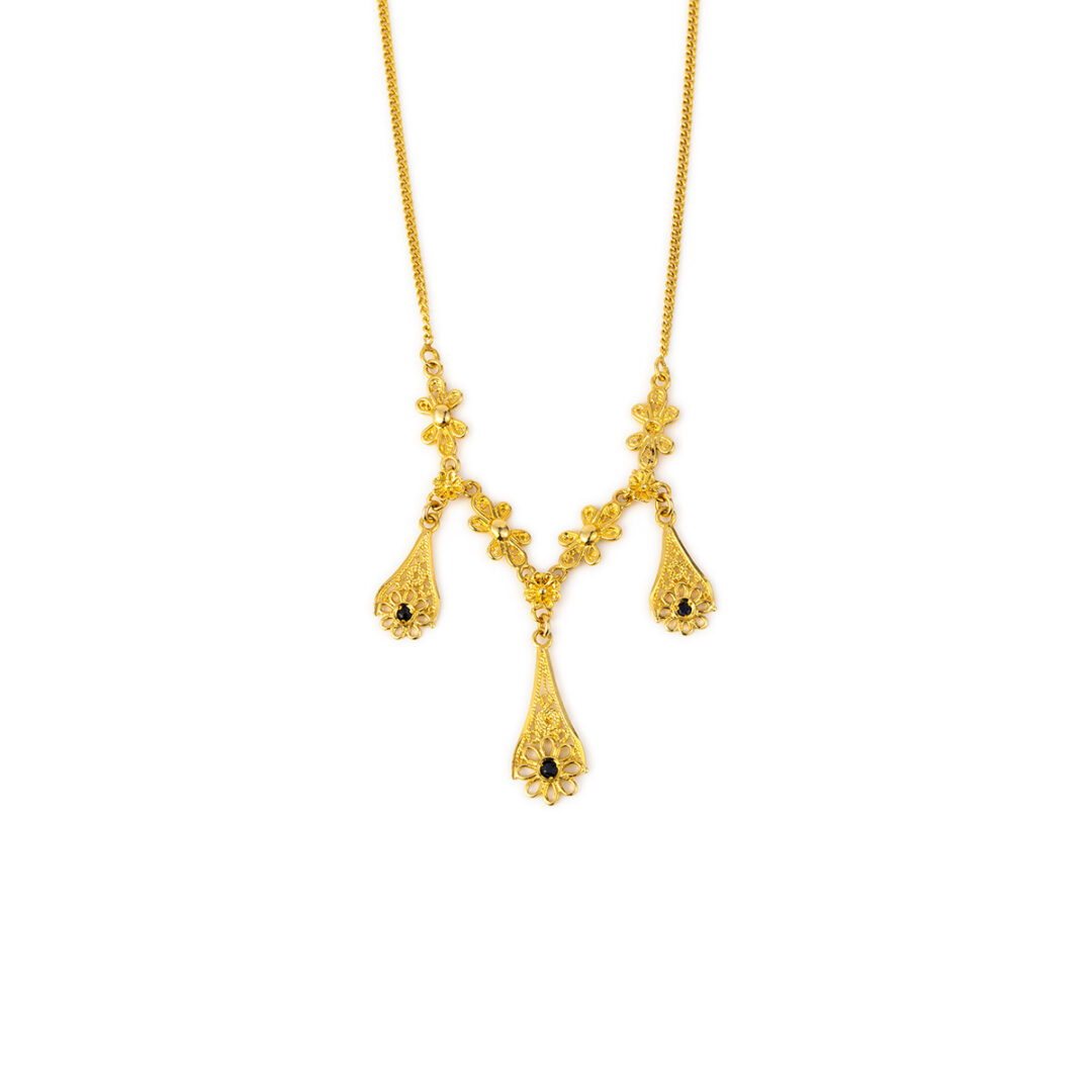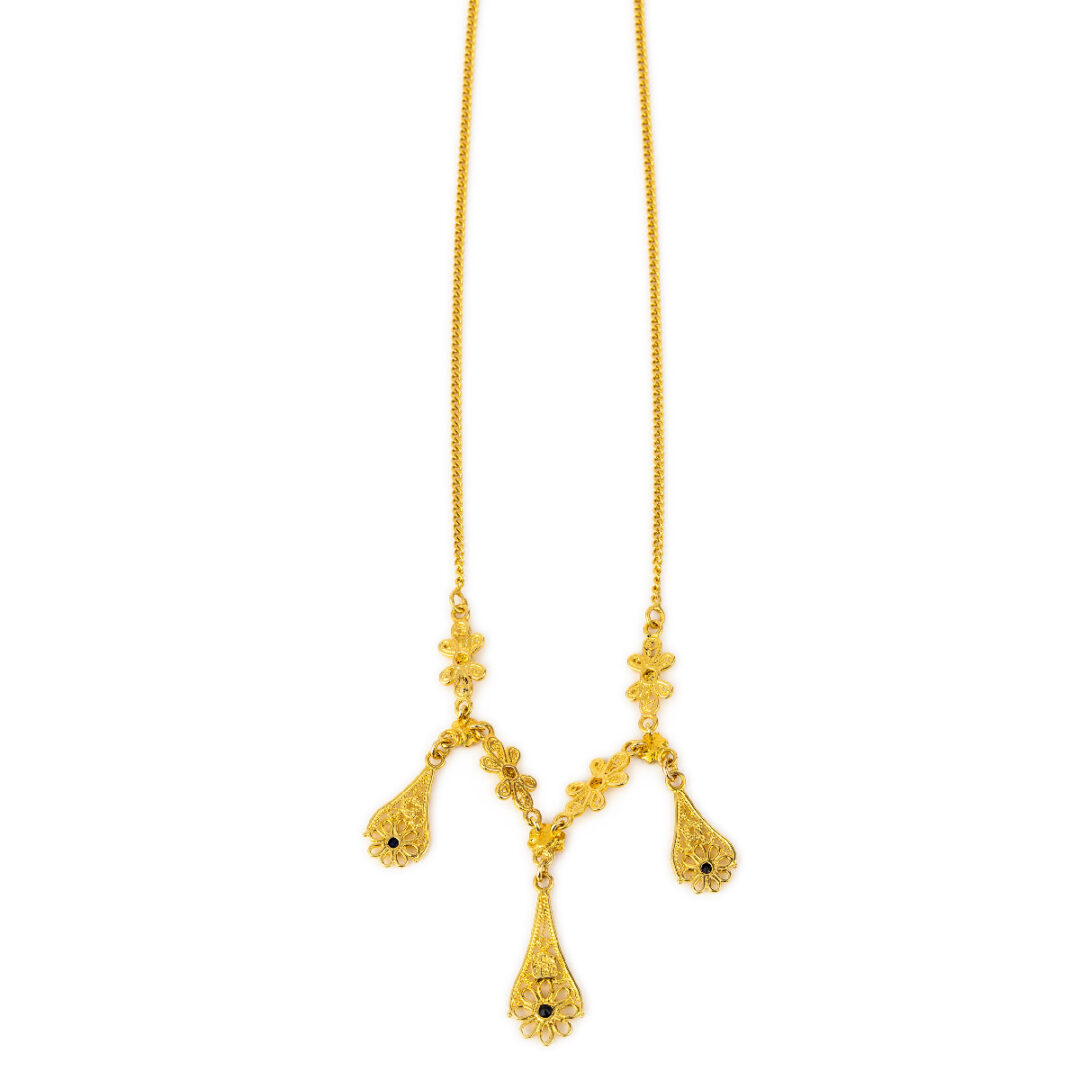 Byzantine necklace embellished with fine filigree and three rosettes flowers which are decorated with a sapphire