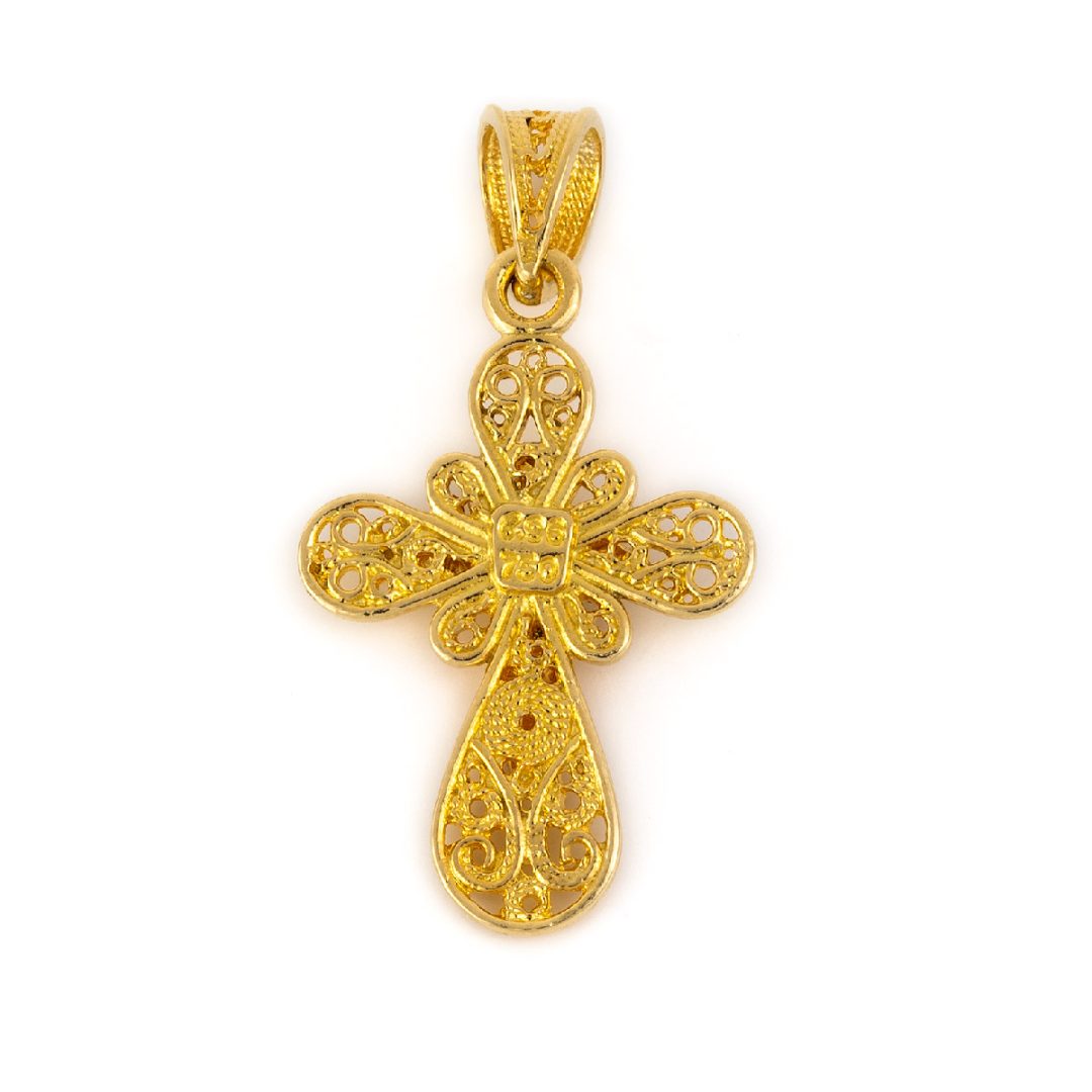 Byzantine Cross embellished with fine filigree and a sapphire or ruby or emerald gemstone in the middle.