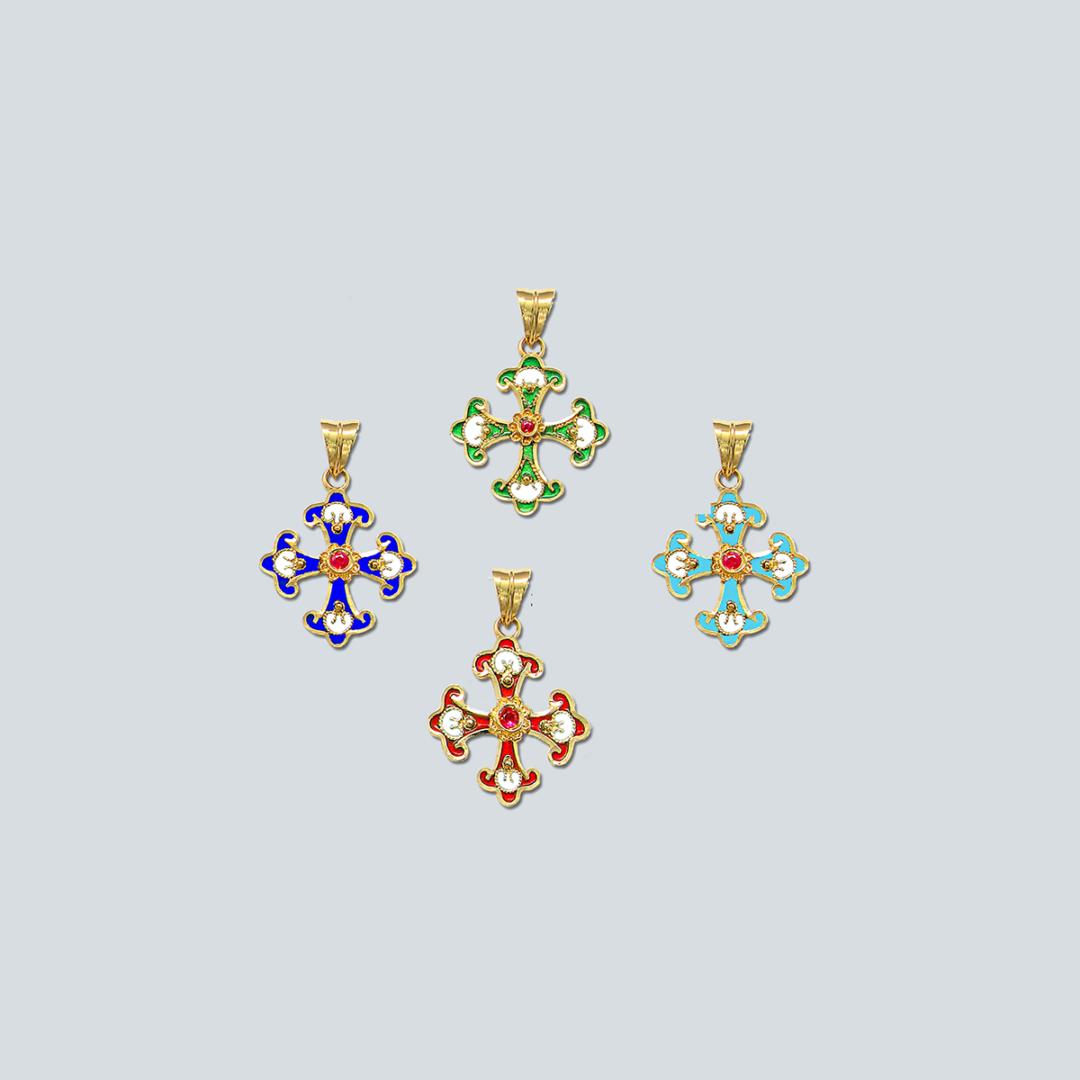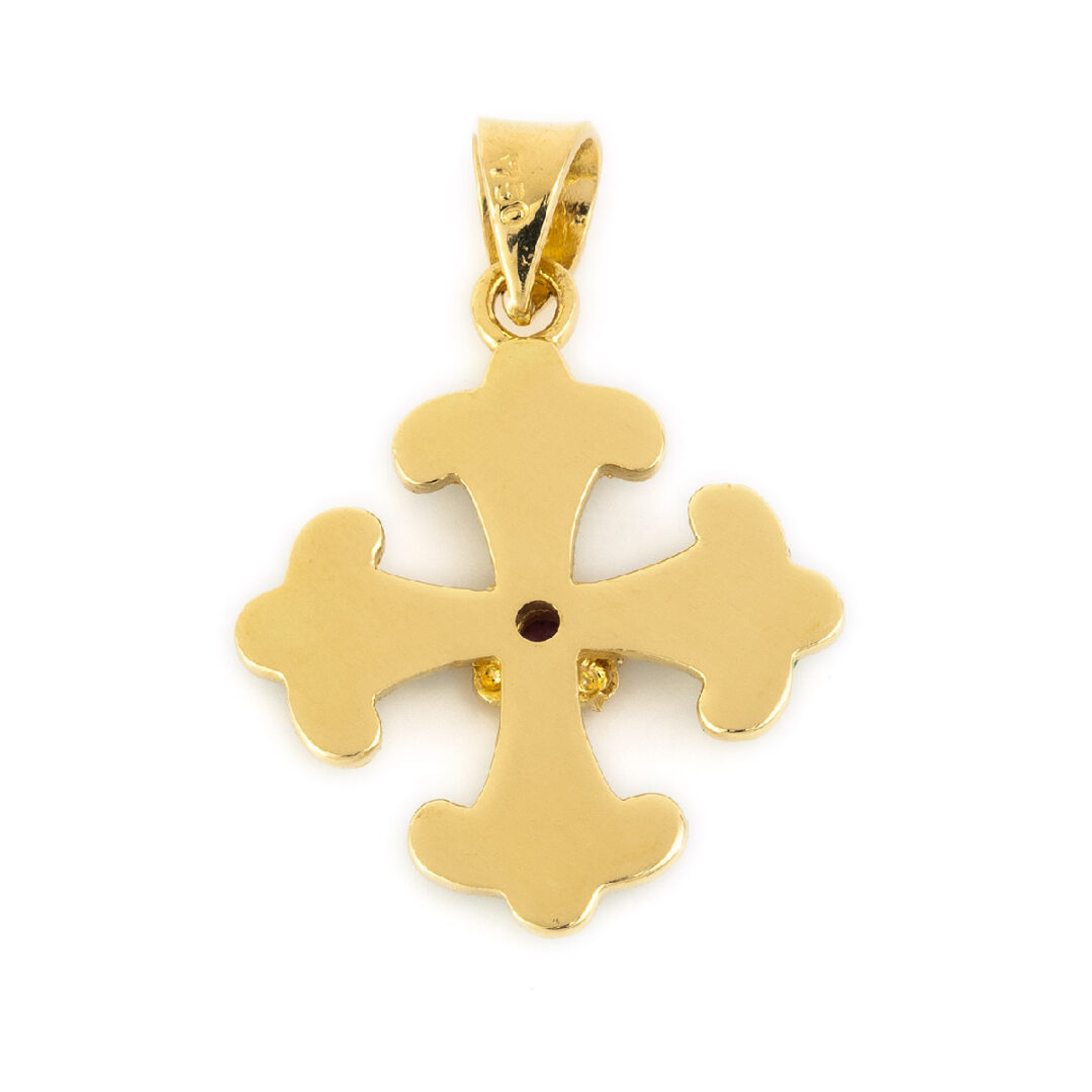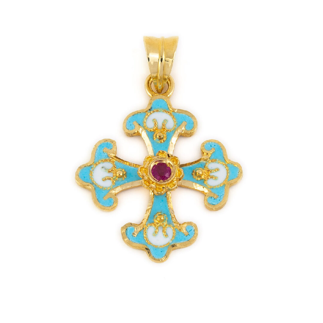 Byzantine Cross embellished with enamel, with a rosette flower in the center which is decorated with ruby and granules of precious metal.