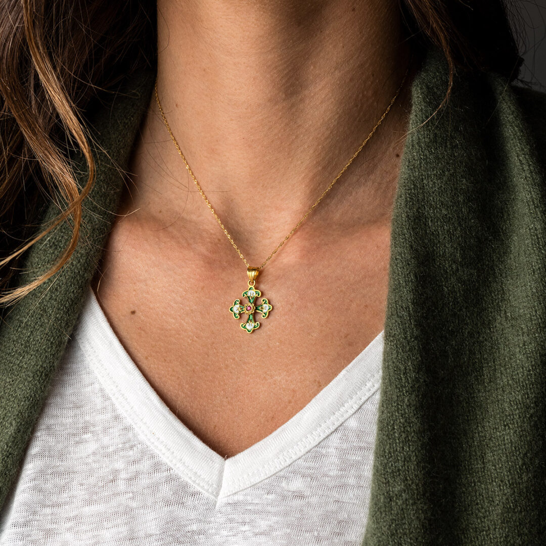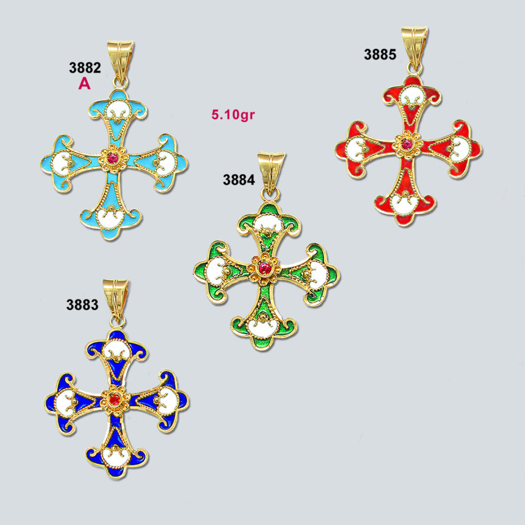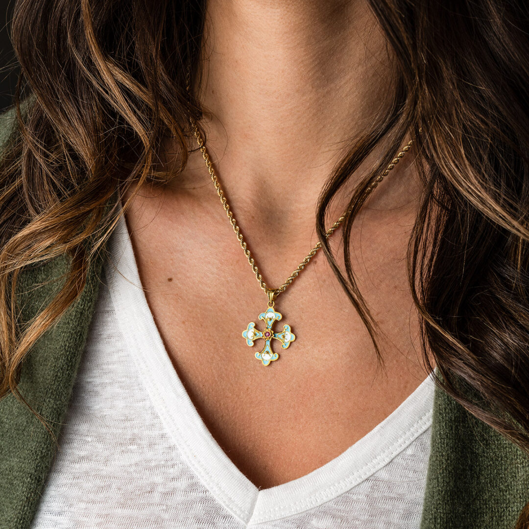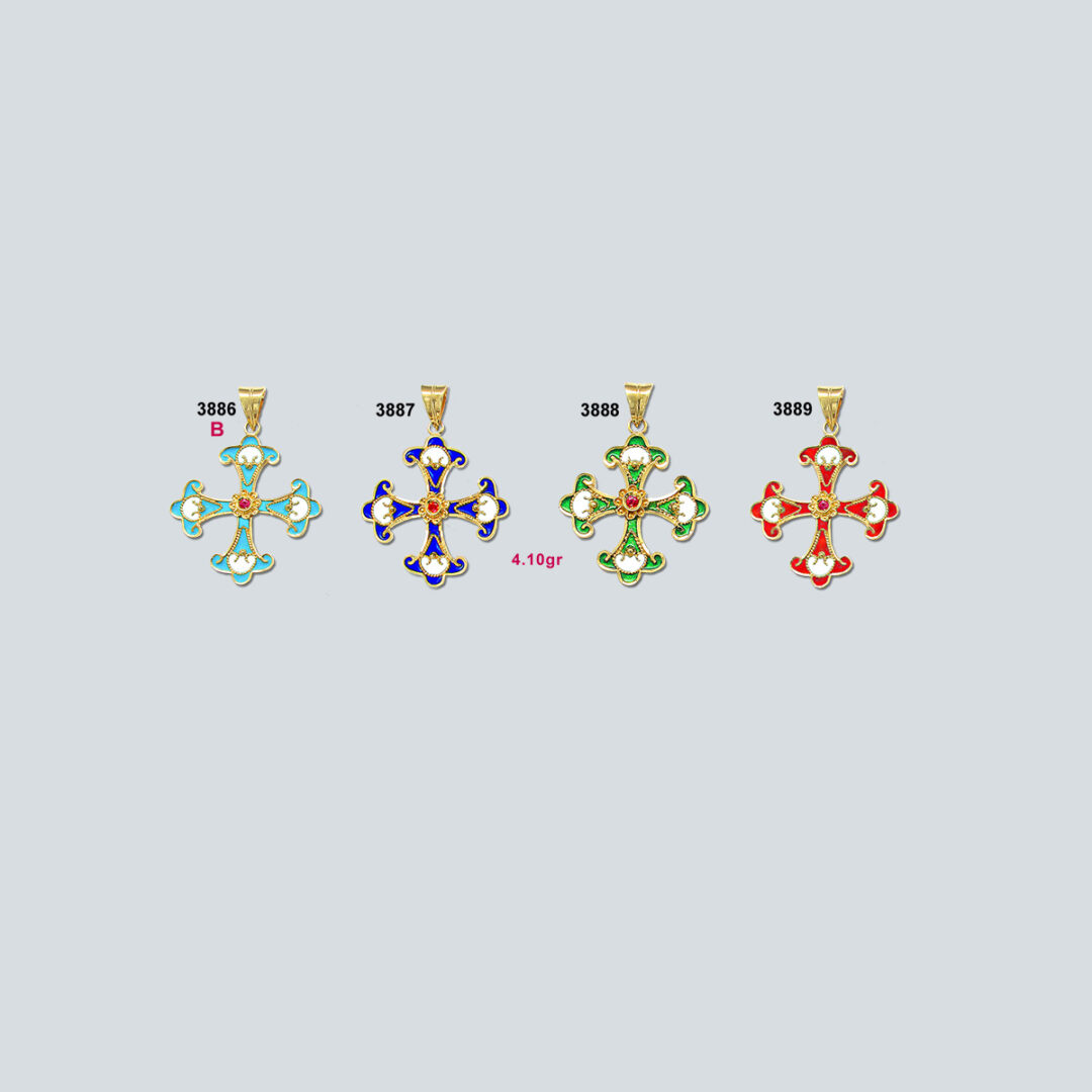 Byzantine Cross embellished with enamel, with a rosette flower in the center which is decorated with ruby and granules of precious metal.