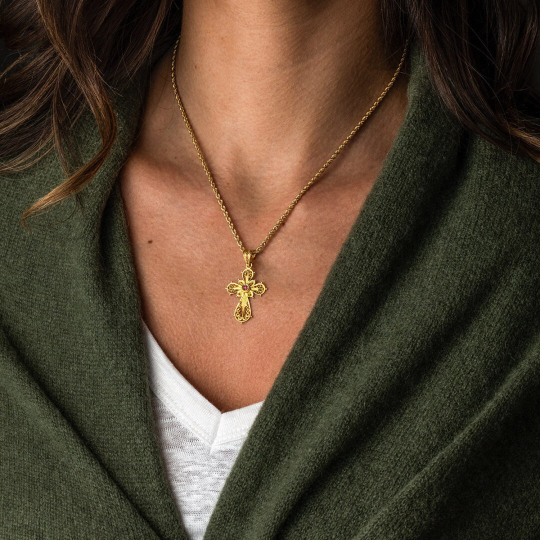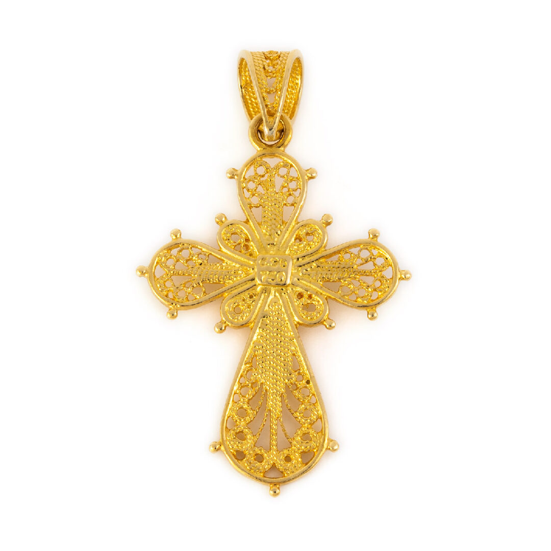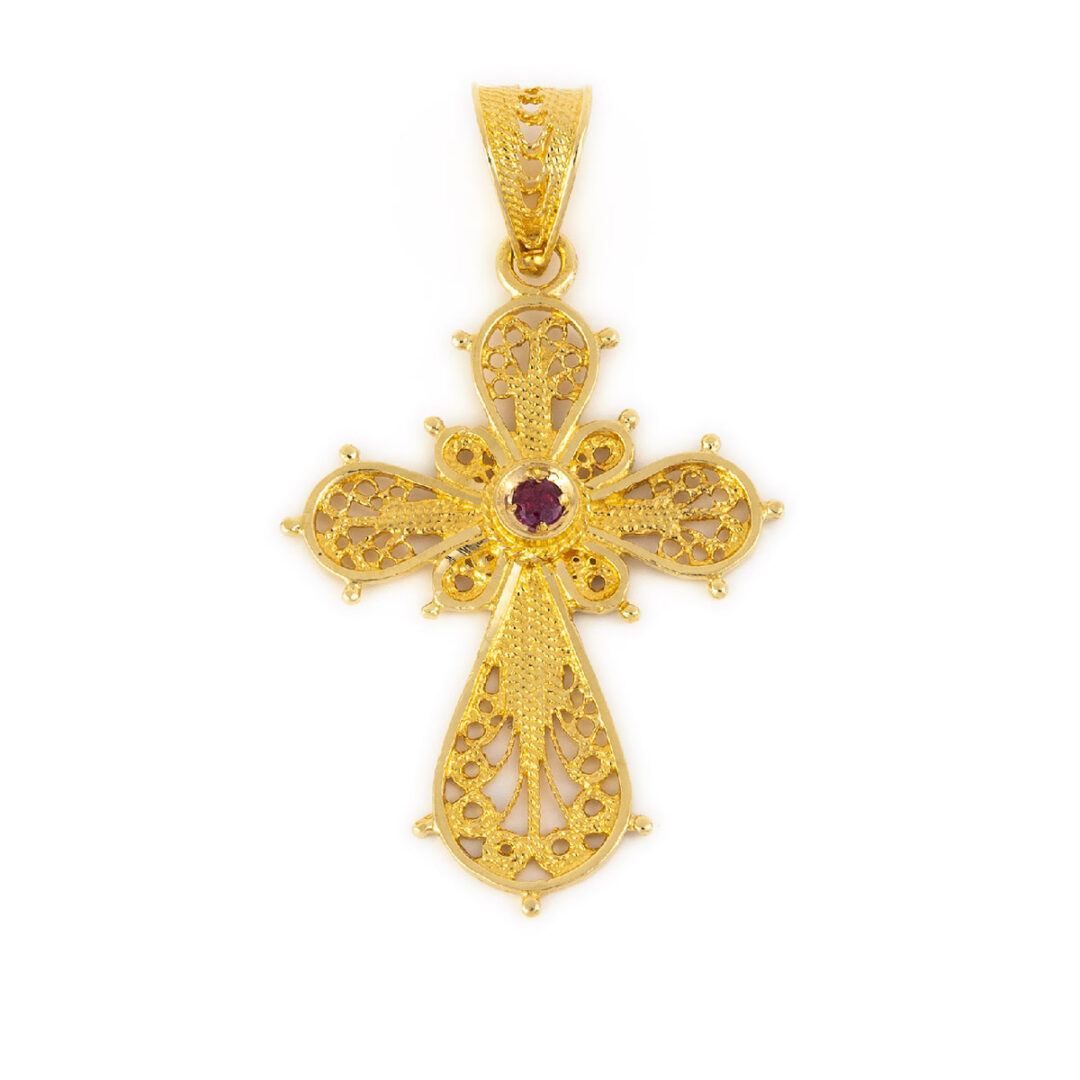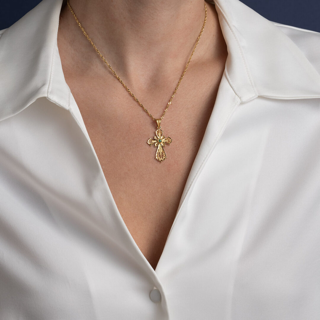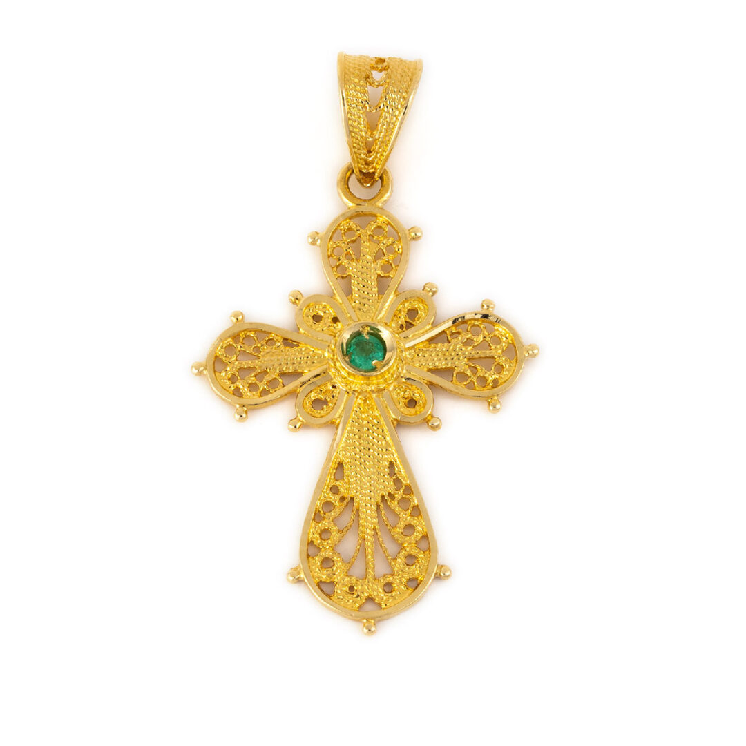 Byzantine Cross embellished with a fine filigree, an emerald gemstone in the middle and granules of precious metal.