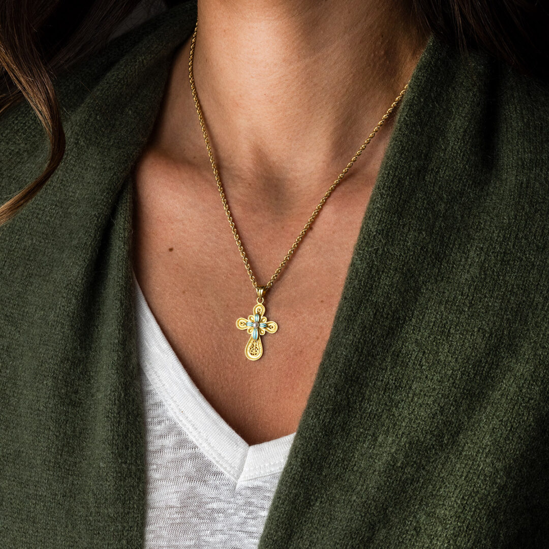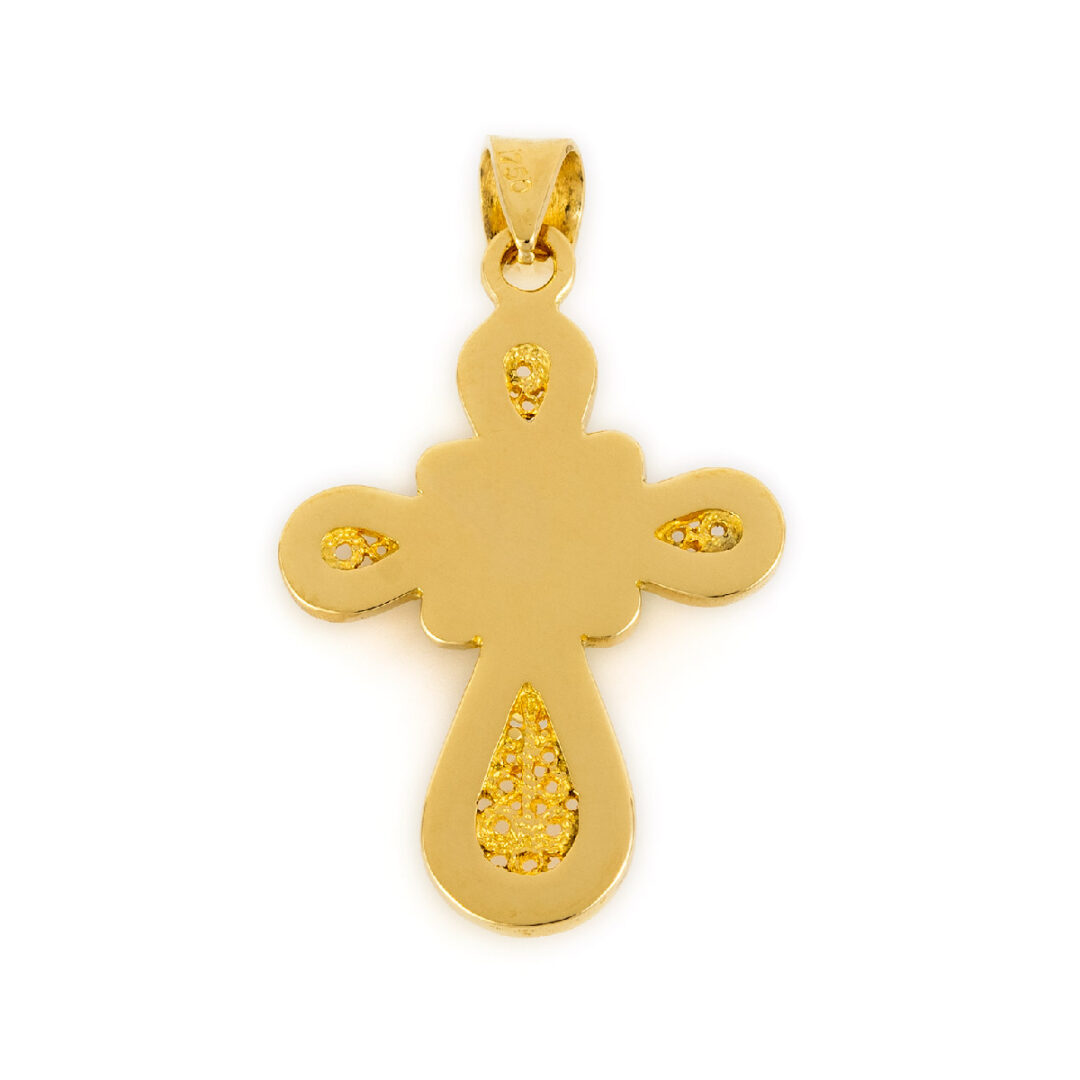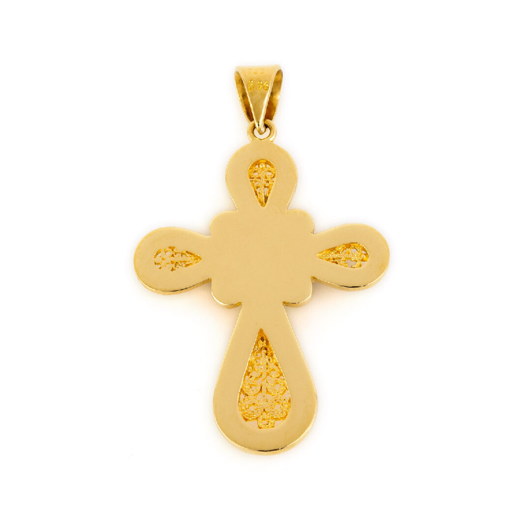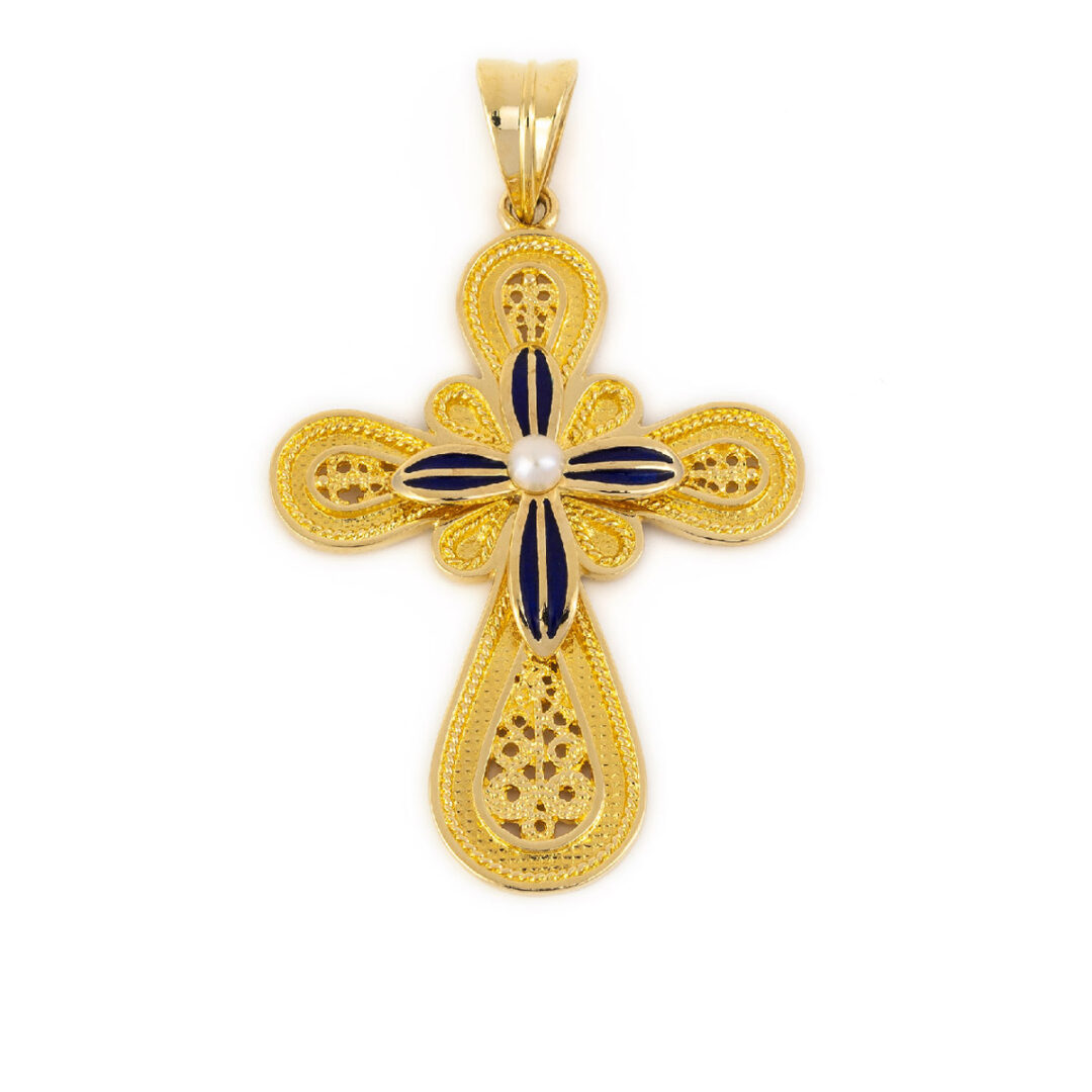 The cross is embellished with a fine filigree, turquoise enamel and pearl.