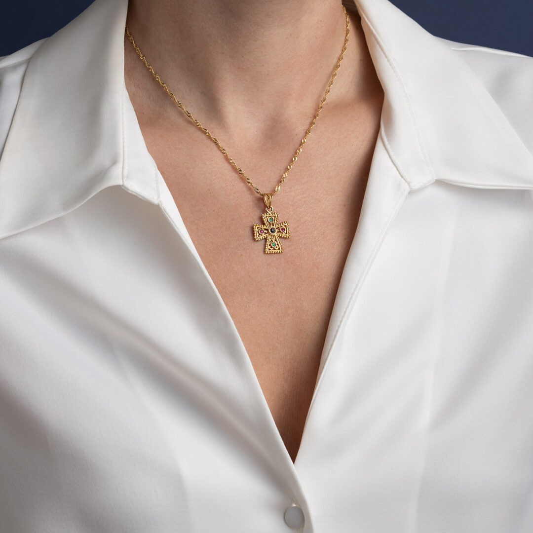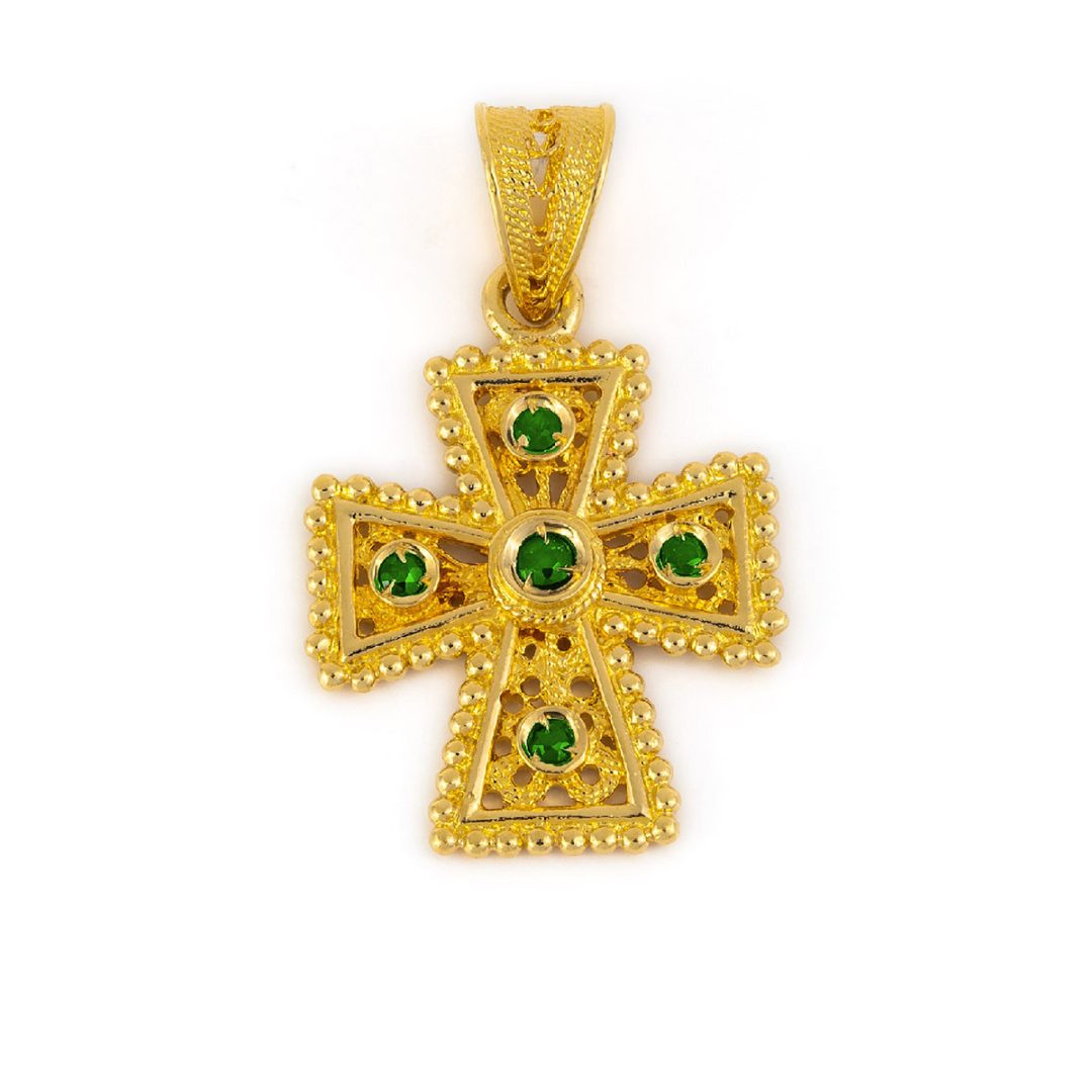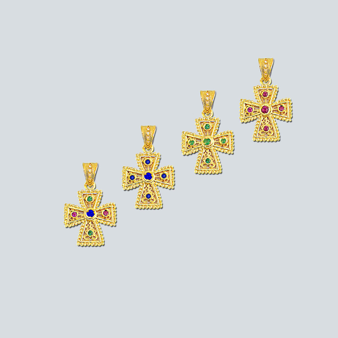 Byzantine Cross decorated with rubies or emeralds or sapphires, granules of precious metal and fine filigree. Choose among emeralds, rubies, sapphires or multi-precious stones.