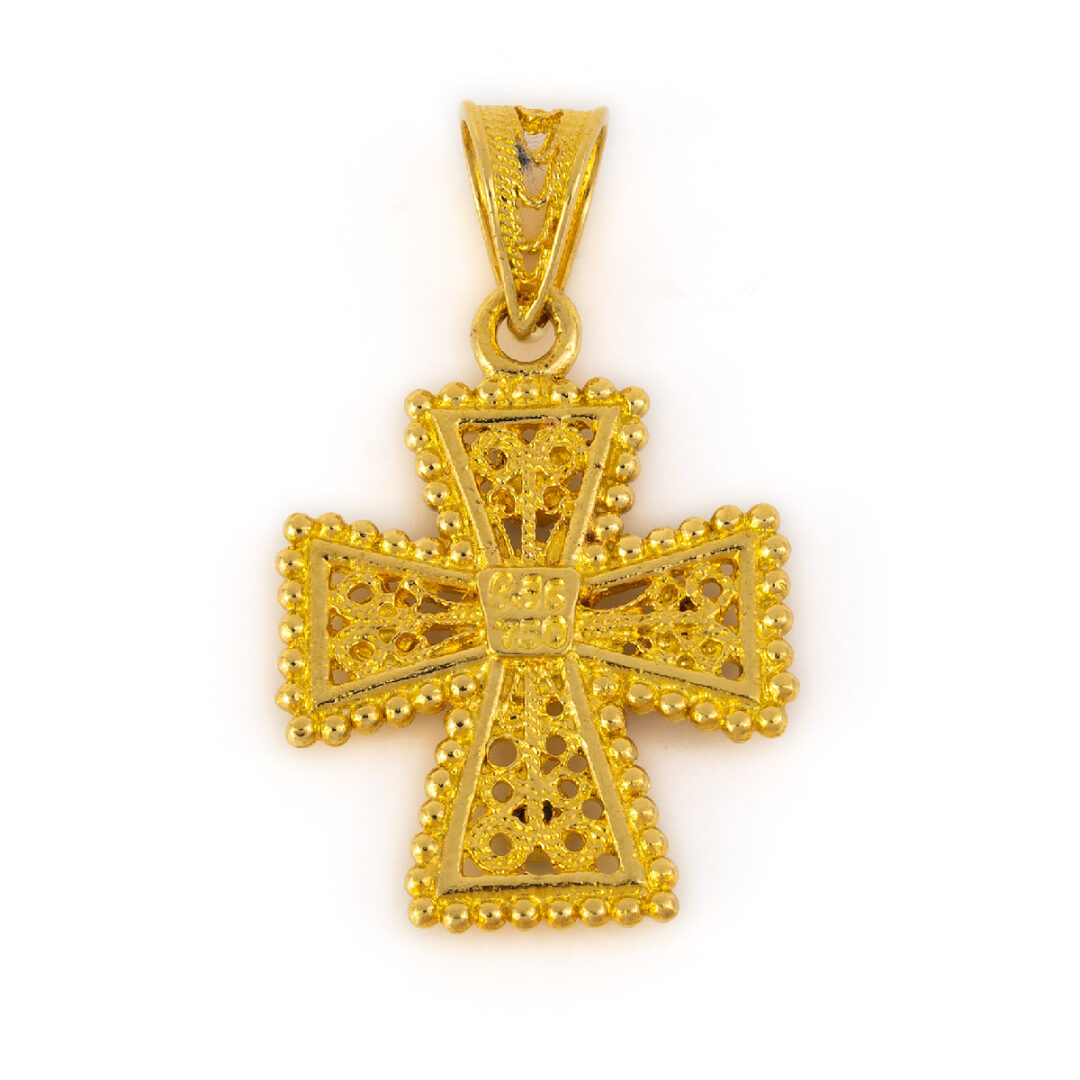 Byzantine Cross is embellished with a fine filigree, a sapphire gemstone in the middle and granules of precious metal