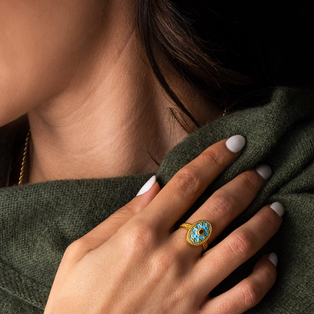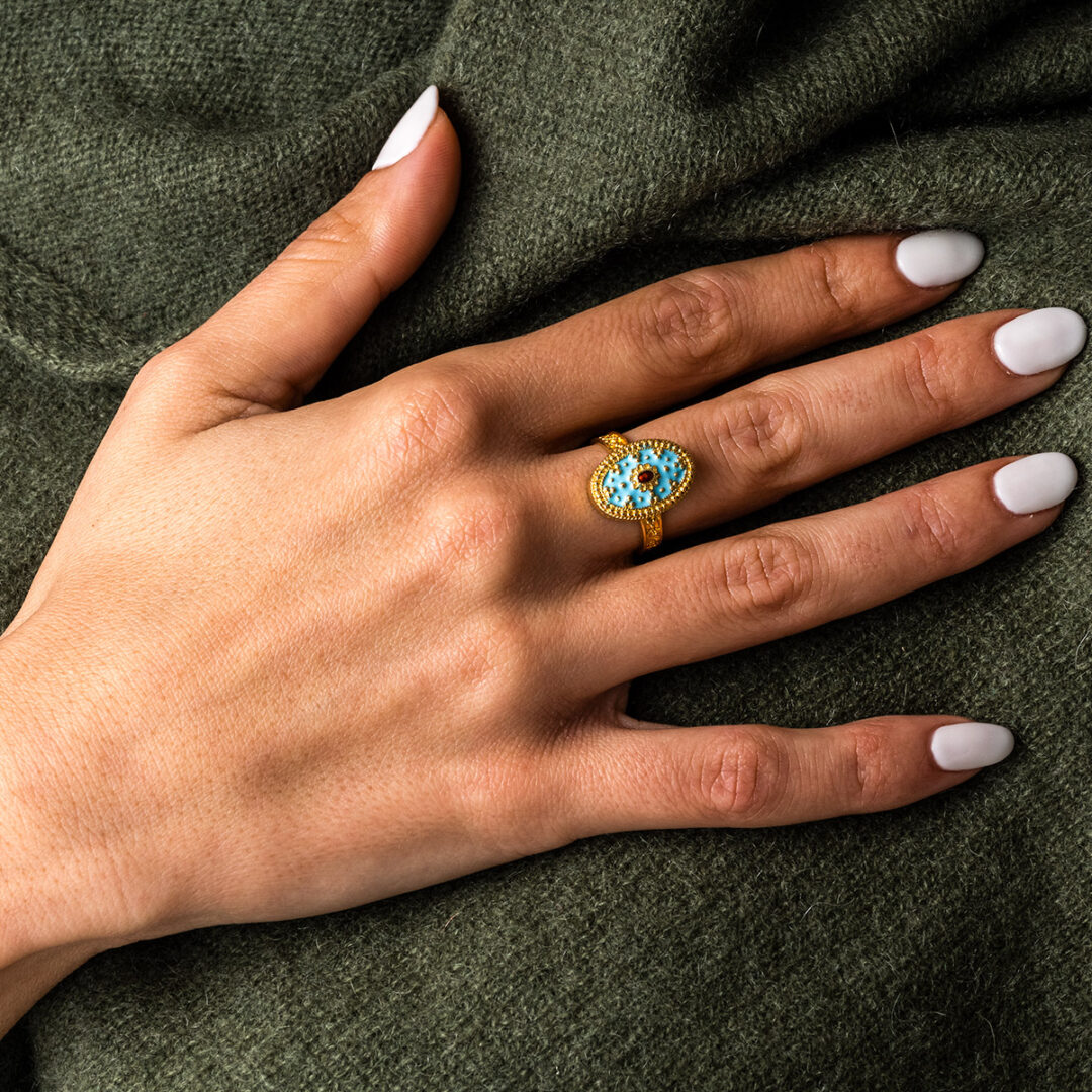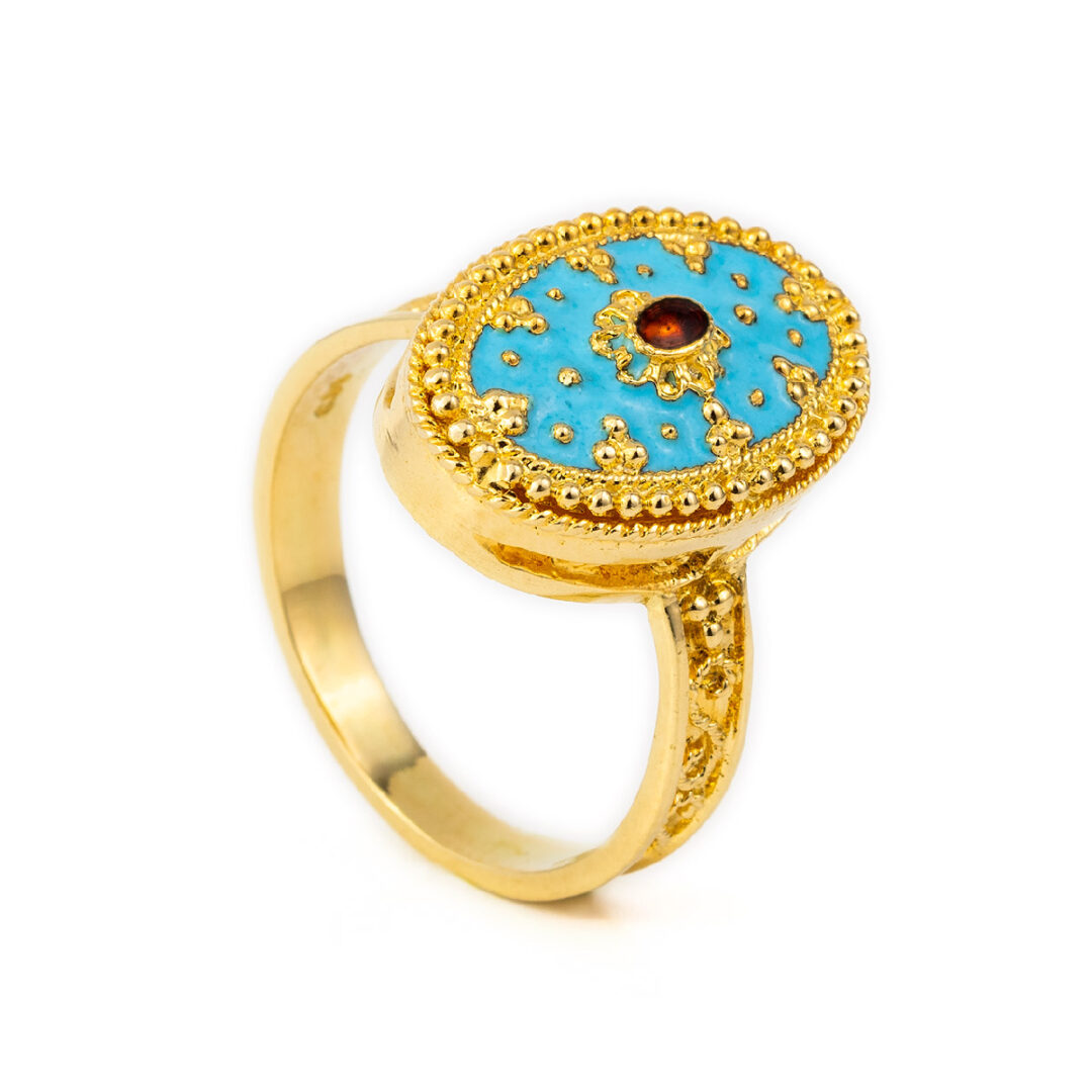 Byzantine Ring is embellished with turquoise and red enamel and granules of precious metal.