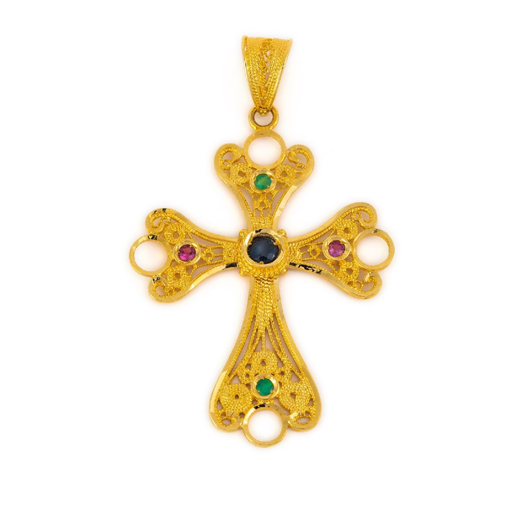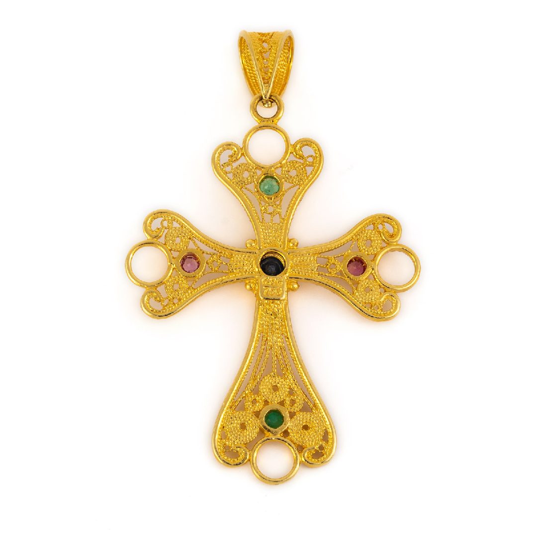 18K Solid Gold Filigree Multi precious Cross