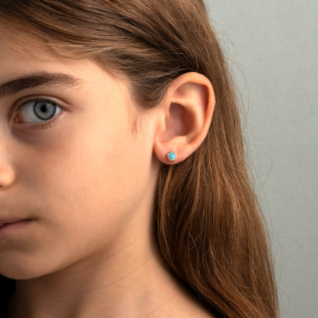 Adorable 9K gold stud earrings in heart shape decorated with light blue Turquoise for kids, a sweet jewelry gift for little ones.