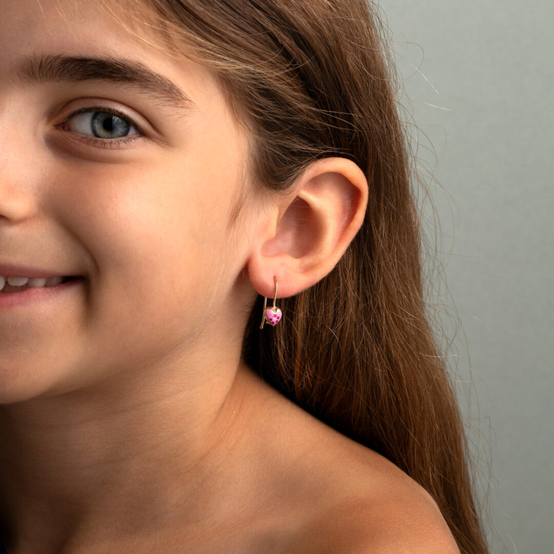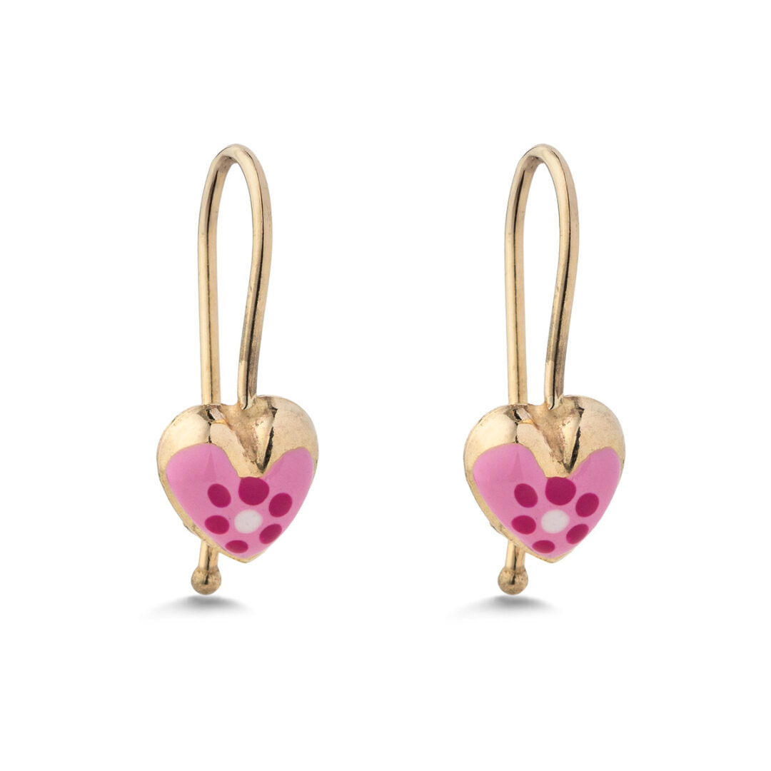 Adorable 9K gold heart dangle earrings for kids, featuring pink, fuchsia and white enamel, a sweet and colorful jewelry gift for little ones.