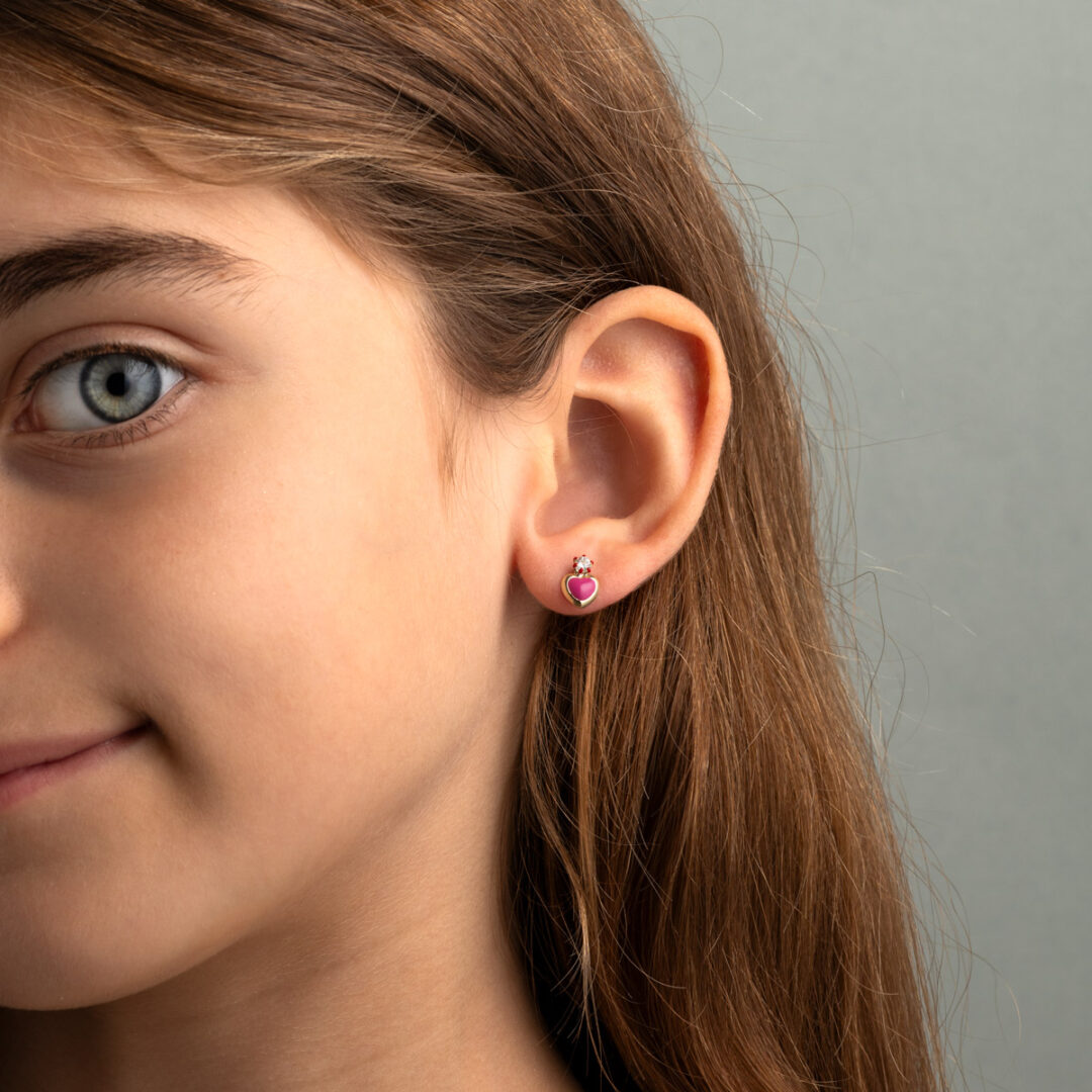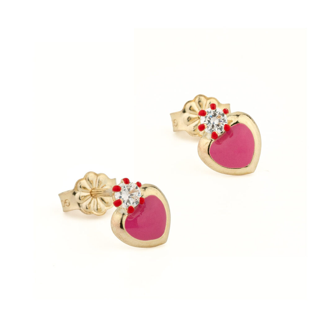 Adorable 9K gold heart stud earrings for kids, featuring pink enamel and a sparkling zircon stone, a sweet and colorful jewelry gift for little ones.