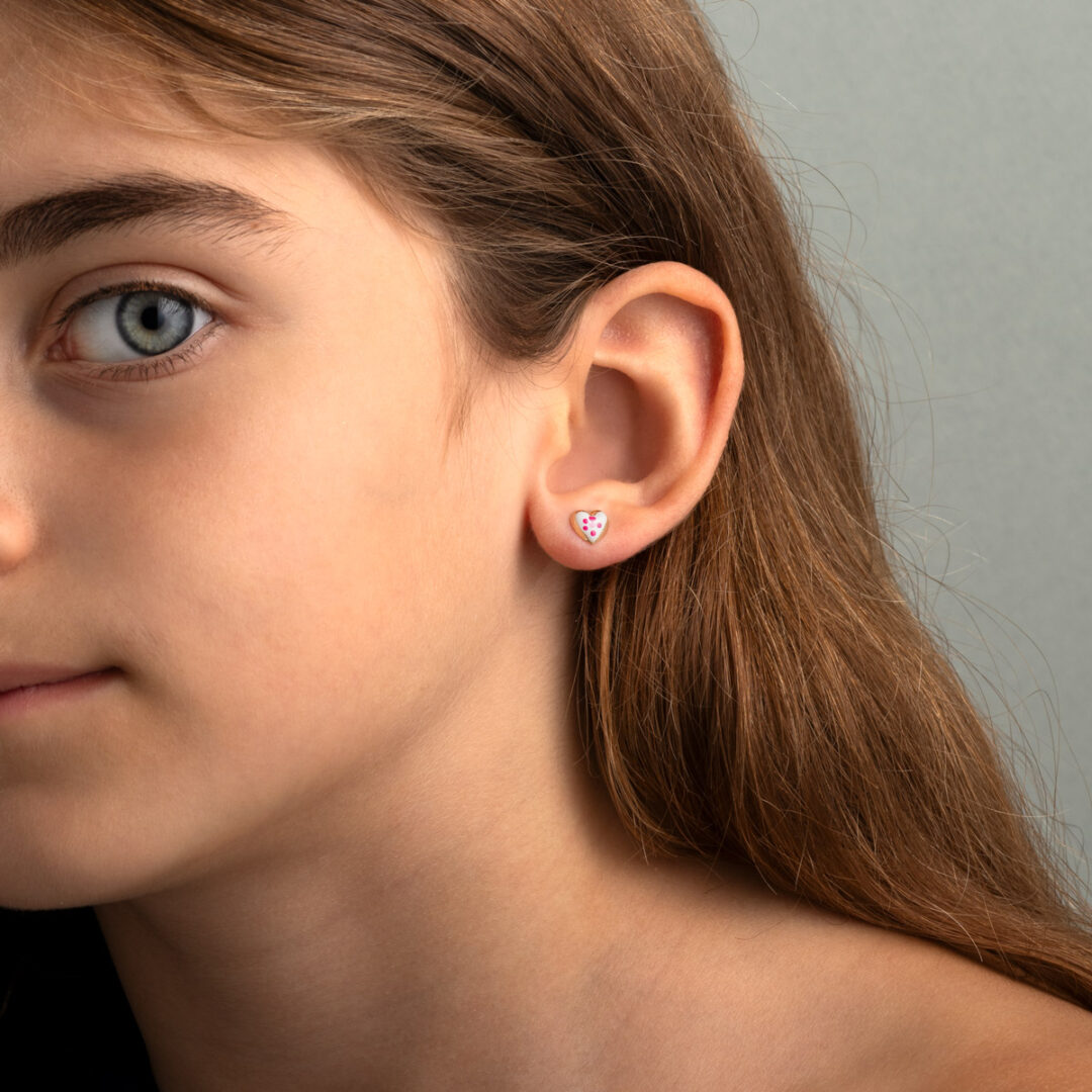Adorable 9K gold heart stud earrings for kids, featuring fuchsia and white enamel, a sweet and colorful jewelry gift for little ones.