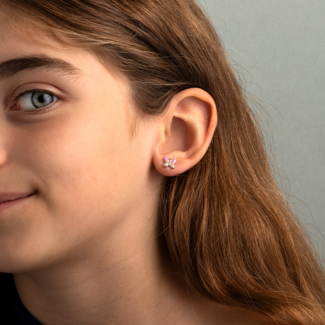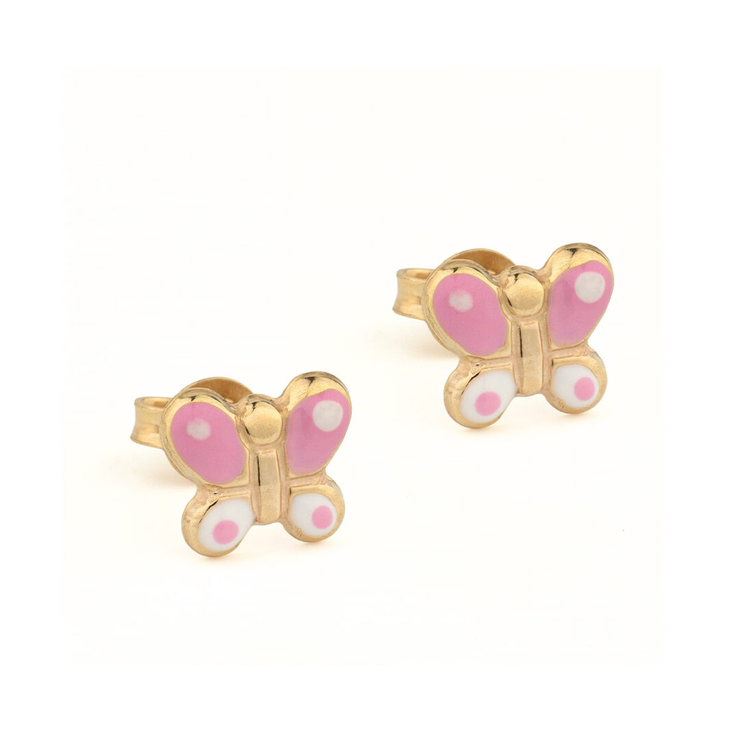 Adorable 9K gold stud earrings in butterfly shape decorated with pink enamel for kids, a sweet jewelry gift for little ones.