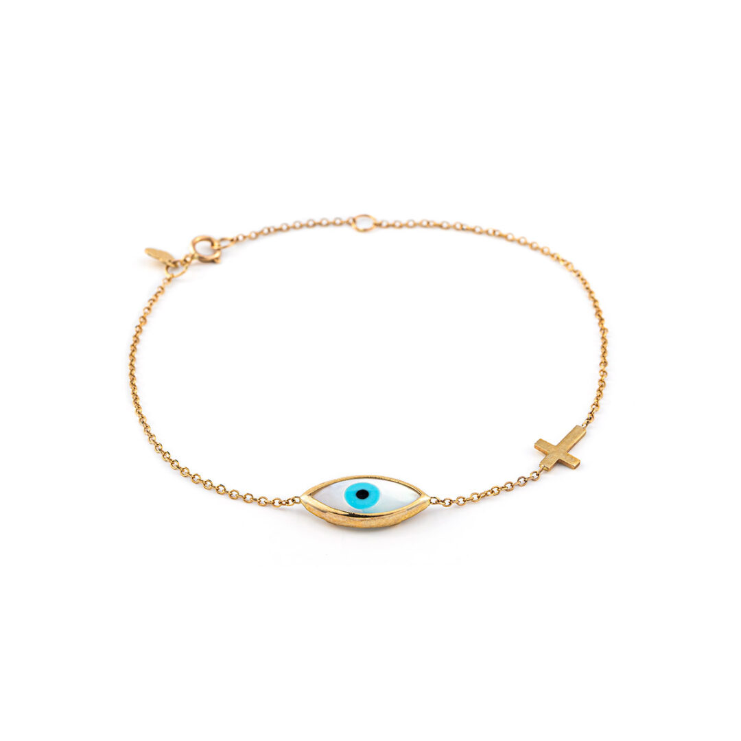 Chain bracelet with the evil eye symbol and a cross.