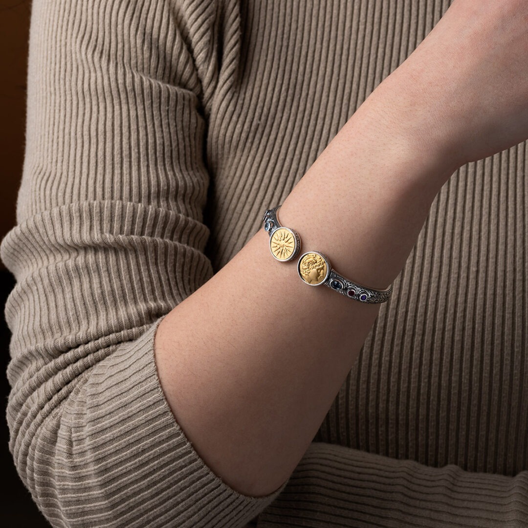 A bracelet inspired by an ancient Greek coin, depicting Alexander the Great and the Vergina Sun symbol.