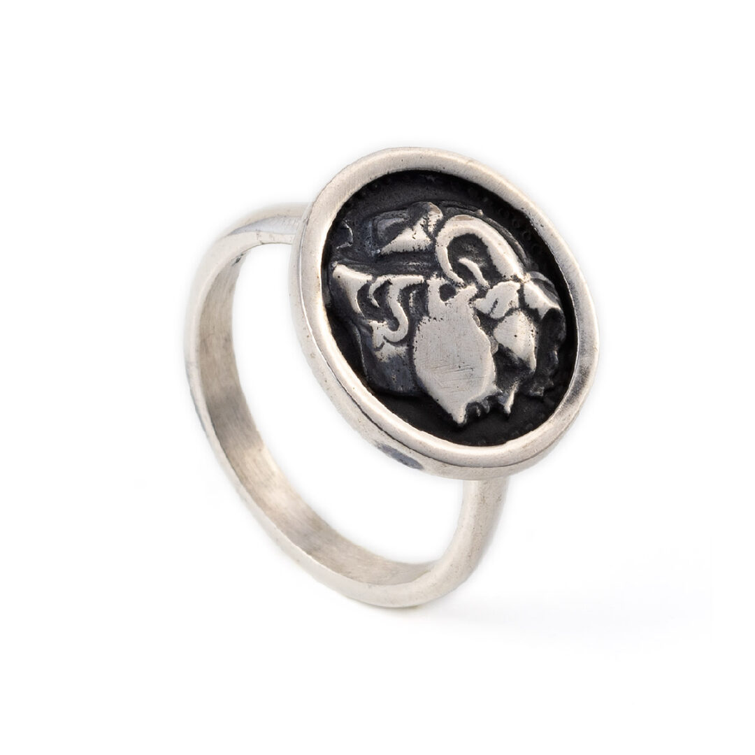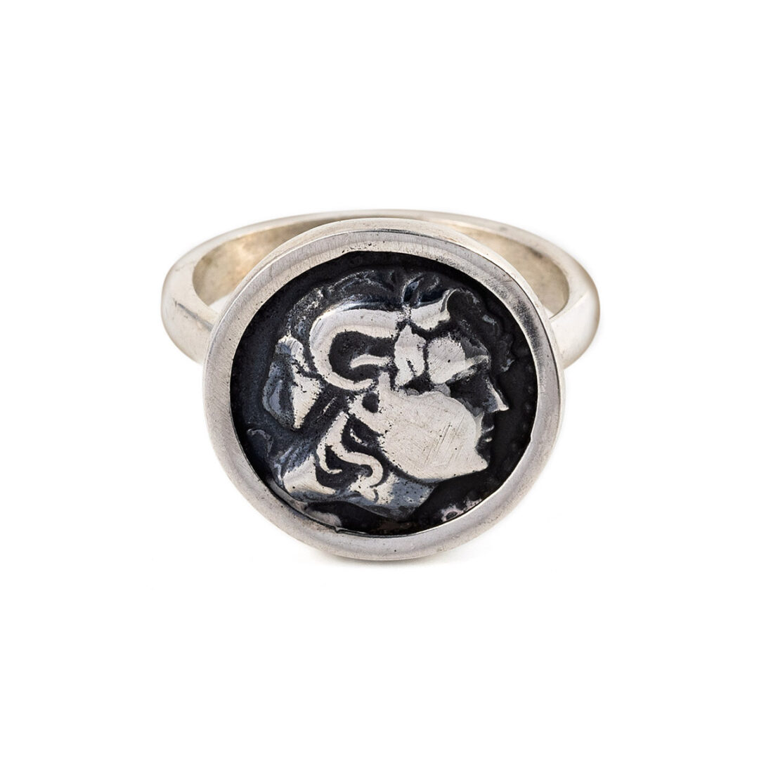 Ring with Ancient Greek coin represent Alexander the great one. Alexander the Great the King of Macedonia is considered one of the most important forms of world history.