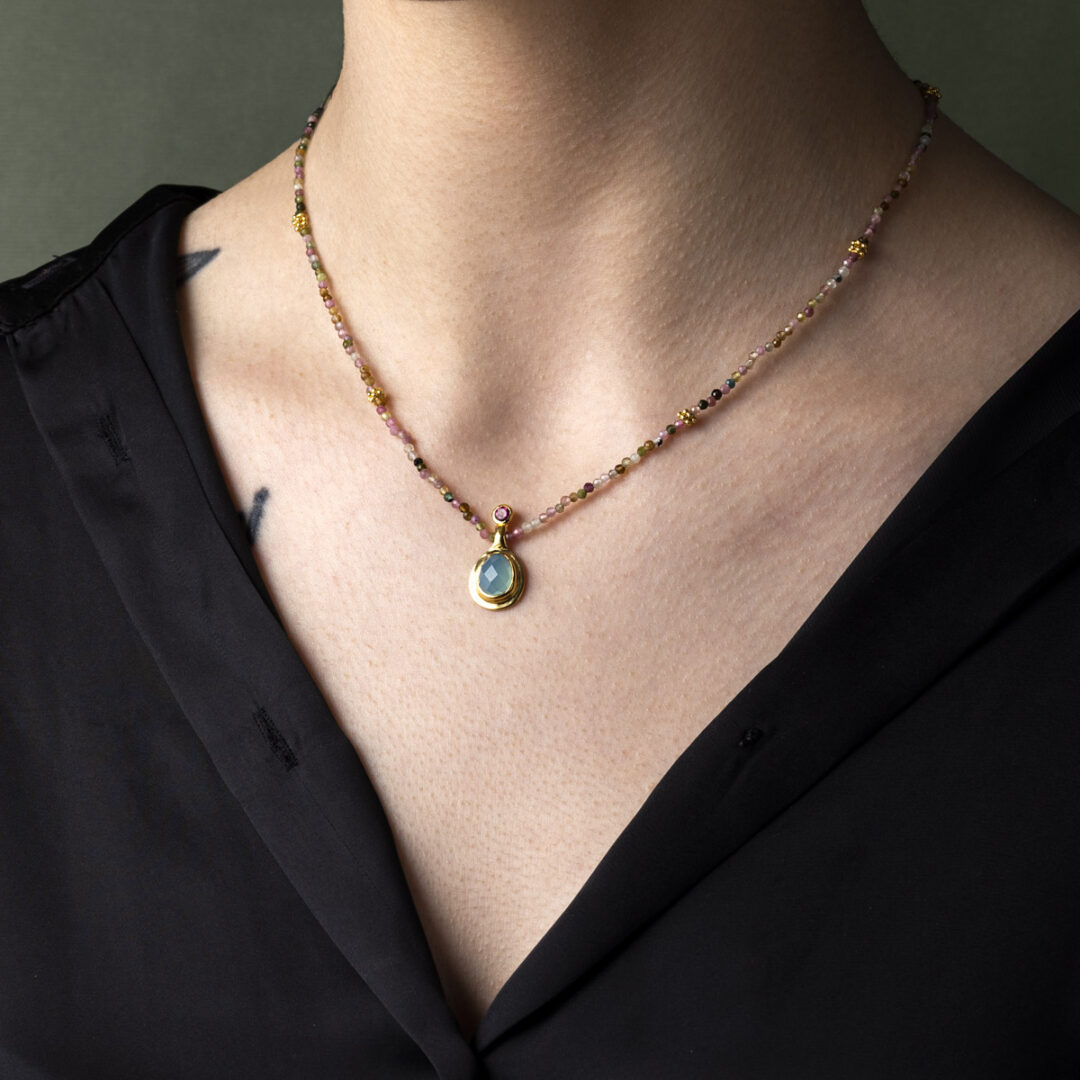 Aqua Chalcedony and Tourmaline Necklace – 925 Sterling Silver and Gold Plated