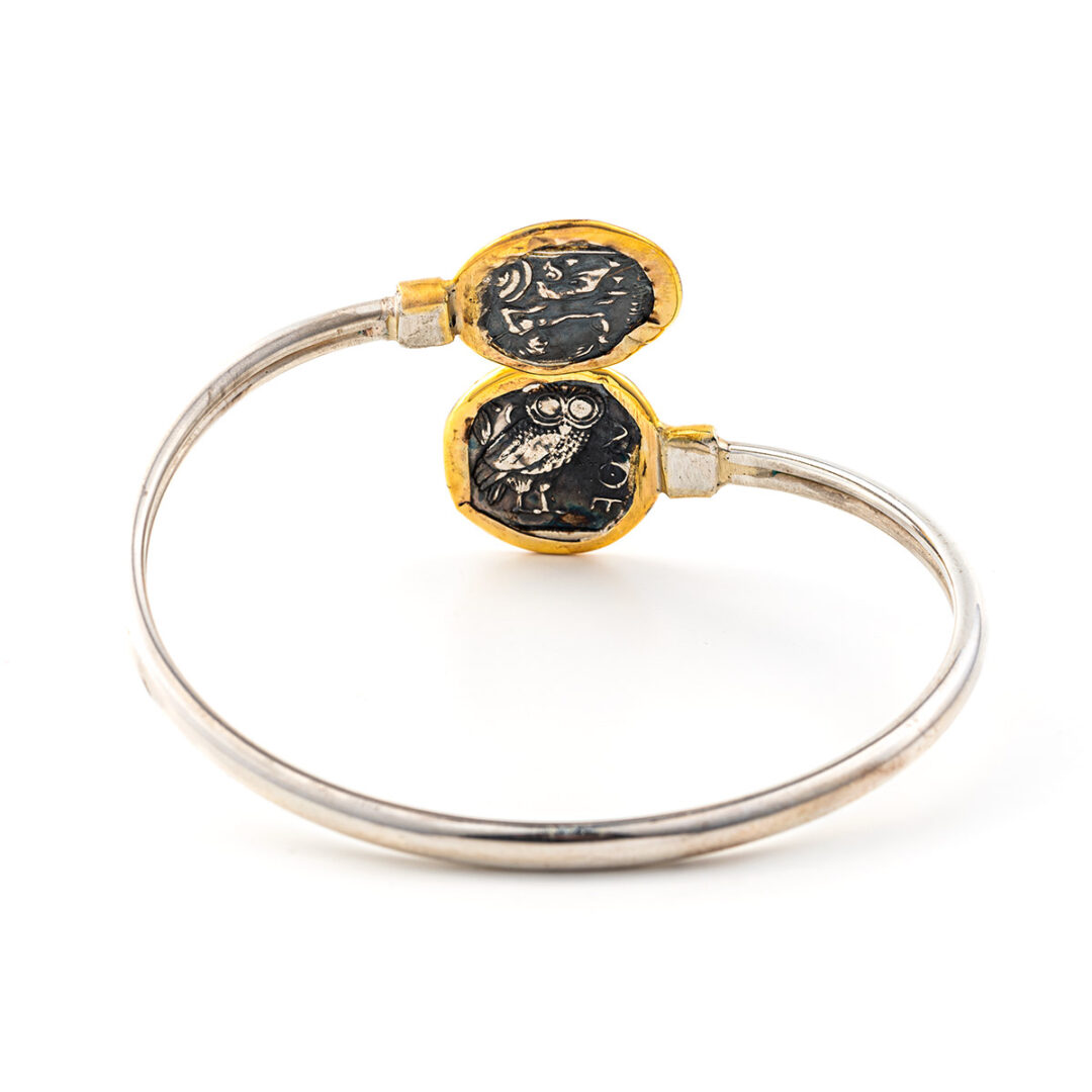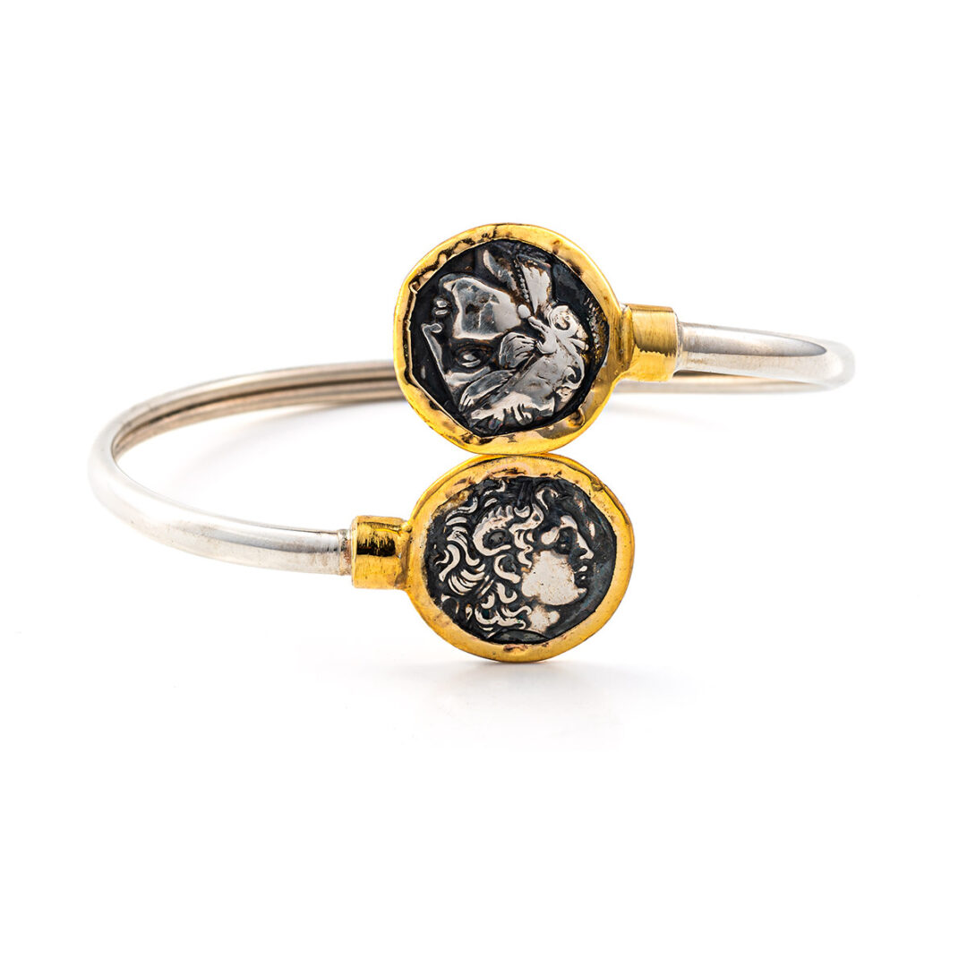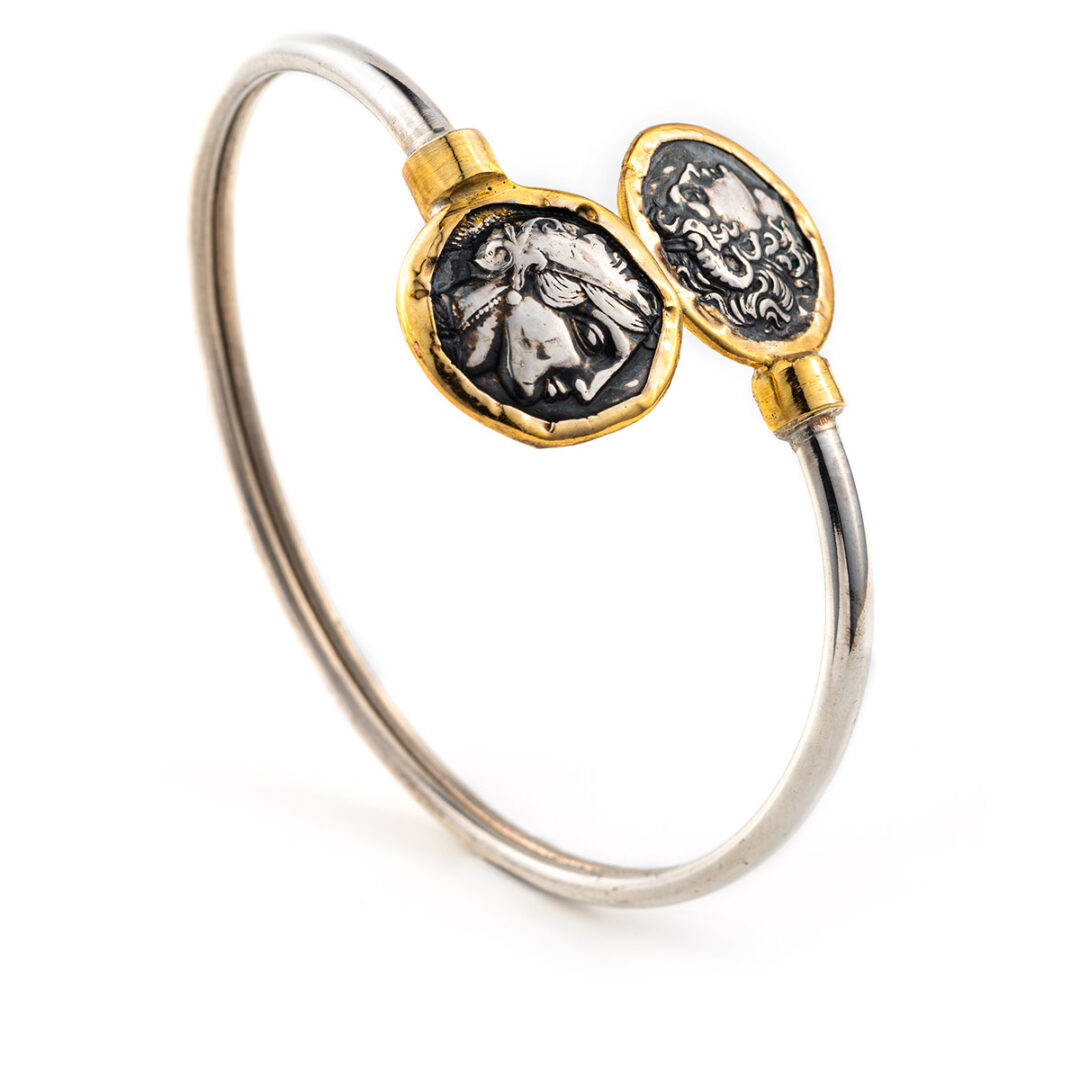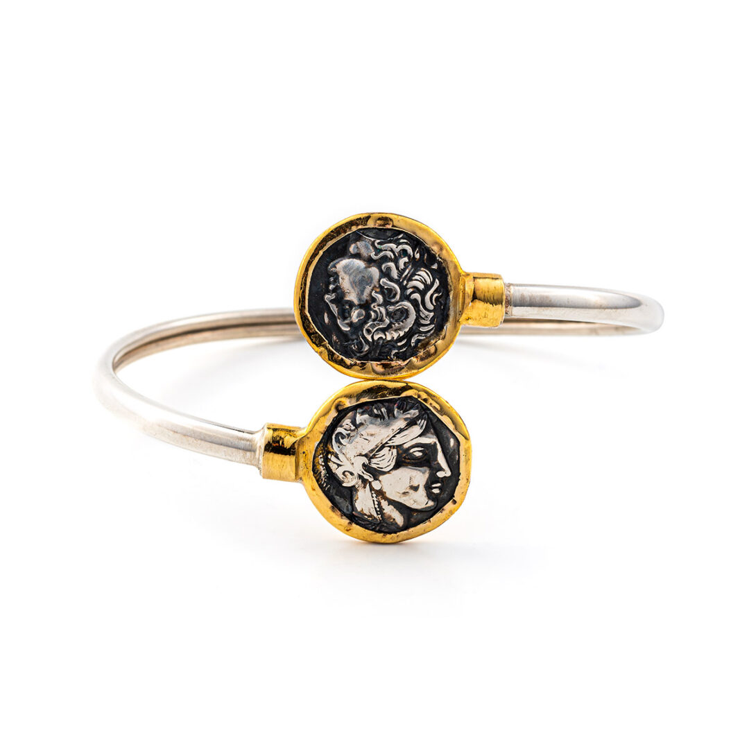 Α beautiful and elegant double bracelet inspired by an ancient Greek tetradrachm. These coins are the most popular ancient Greek coins which illustrate the portrait of Goddess Athena and the Alexander the Great.