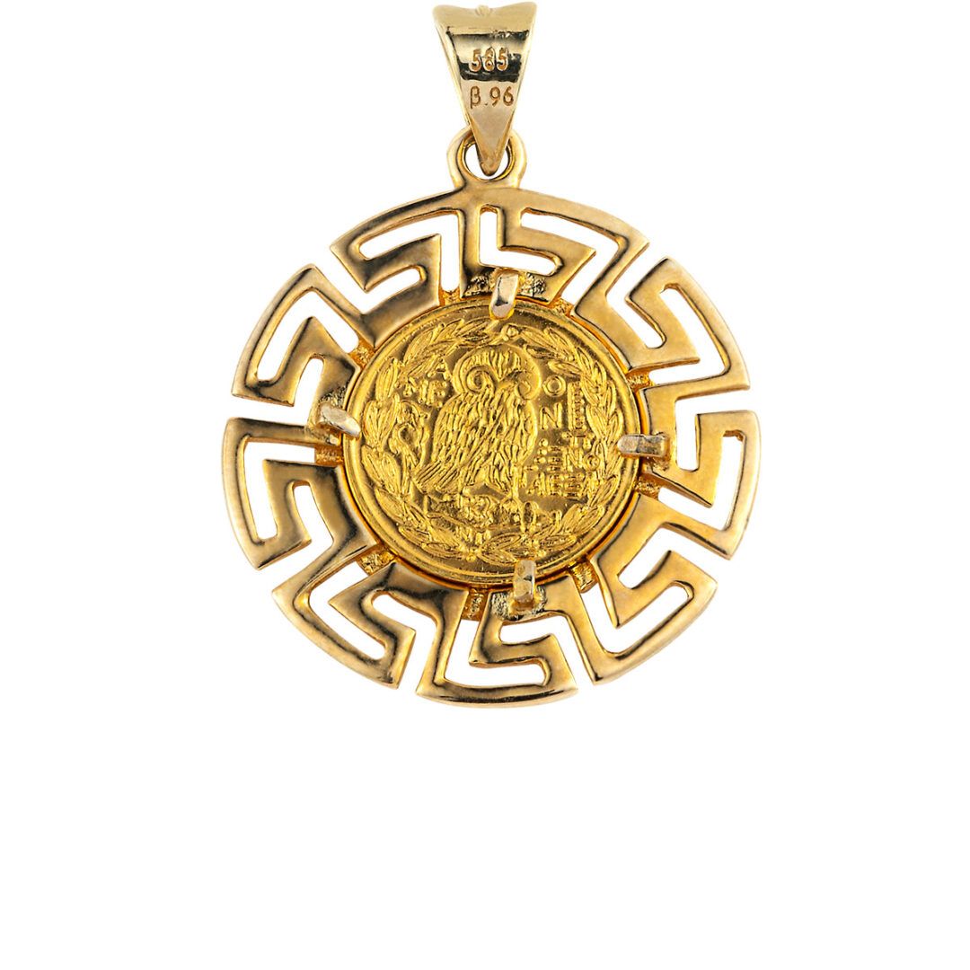 Athena and Owl Pendant with Greek Key – 14K Gold