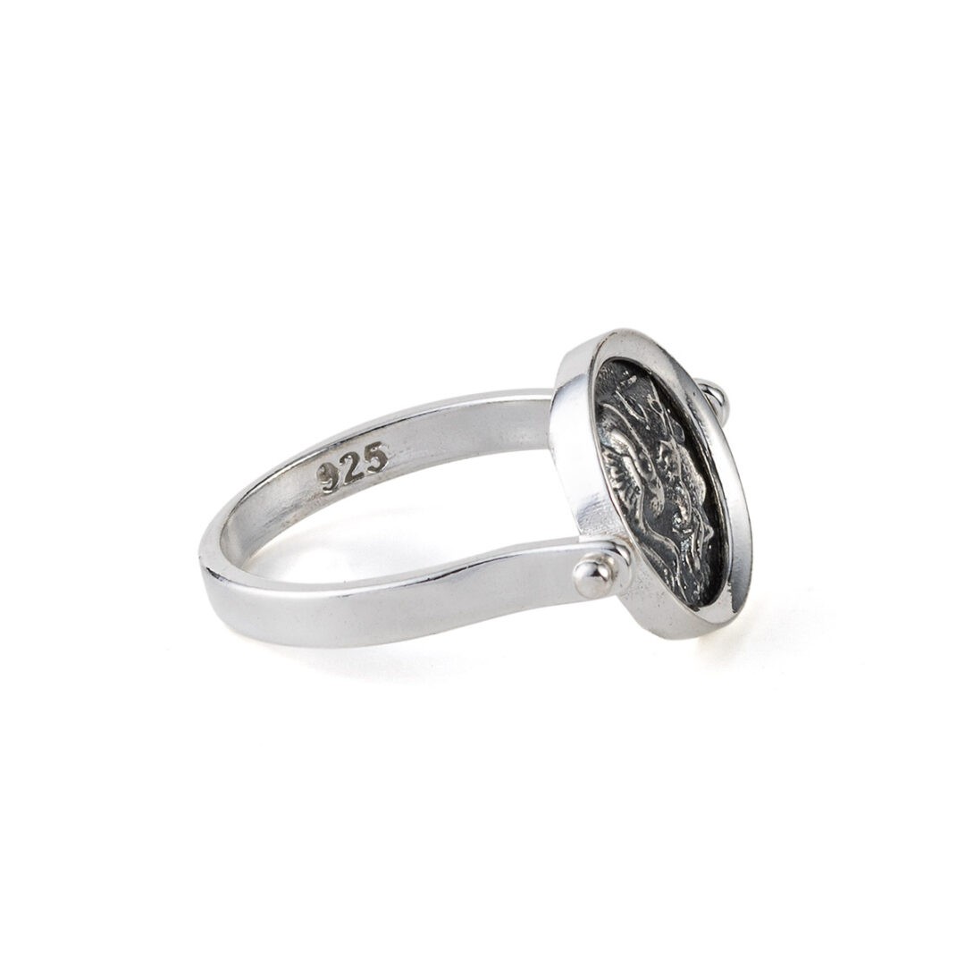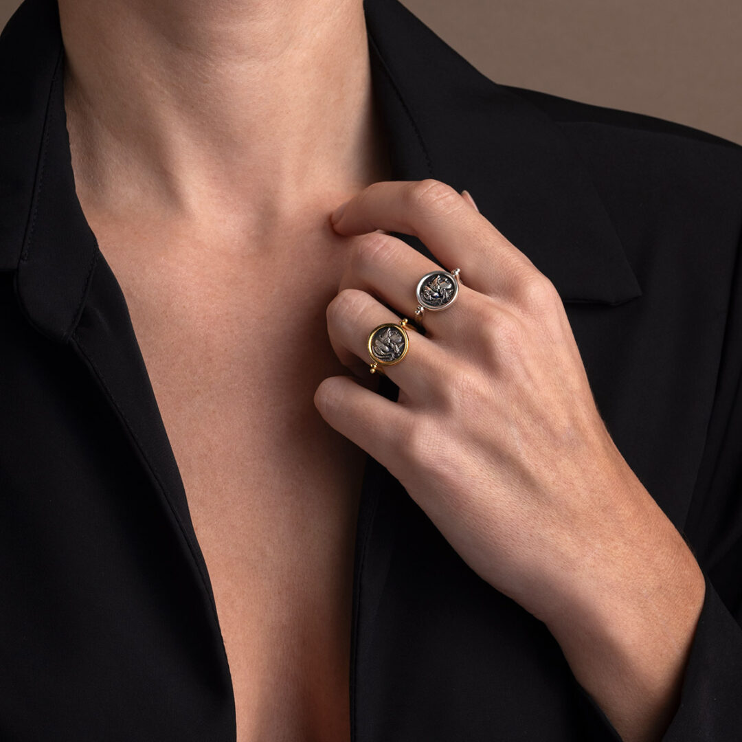 A beautifully crafted swivel-flip coin ring, inspired by the ancient Greek coin issued by Athena Chalinitis.