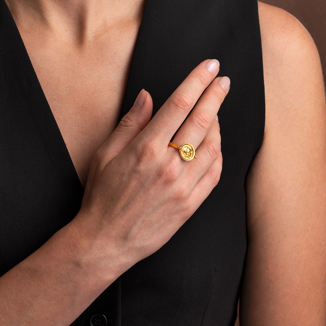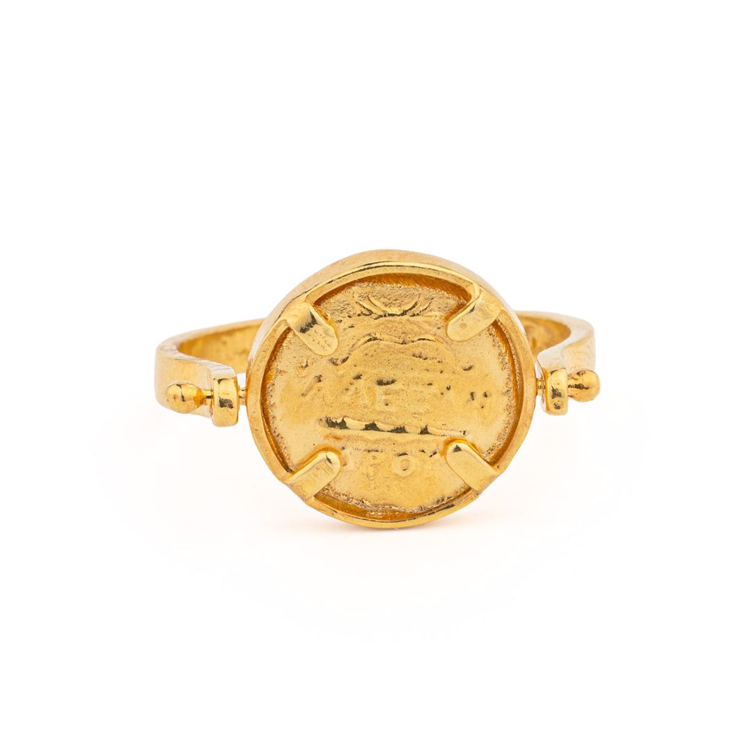 A beautifully crafted swivel-flip coin ring, inspired by the ancient Greek coin issued by Athena Chalinitis.