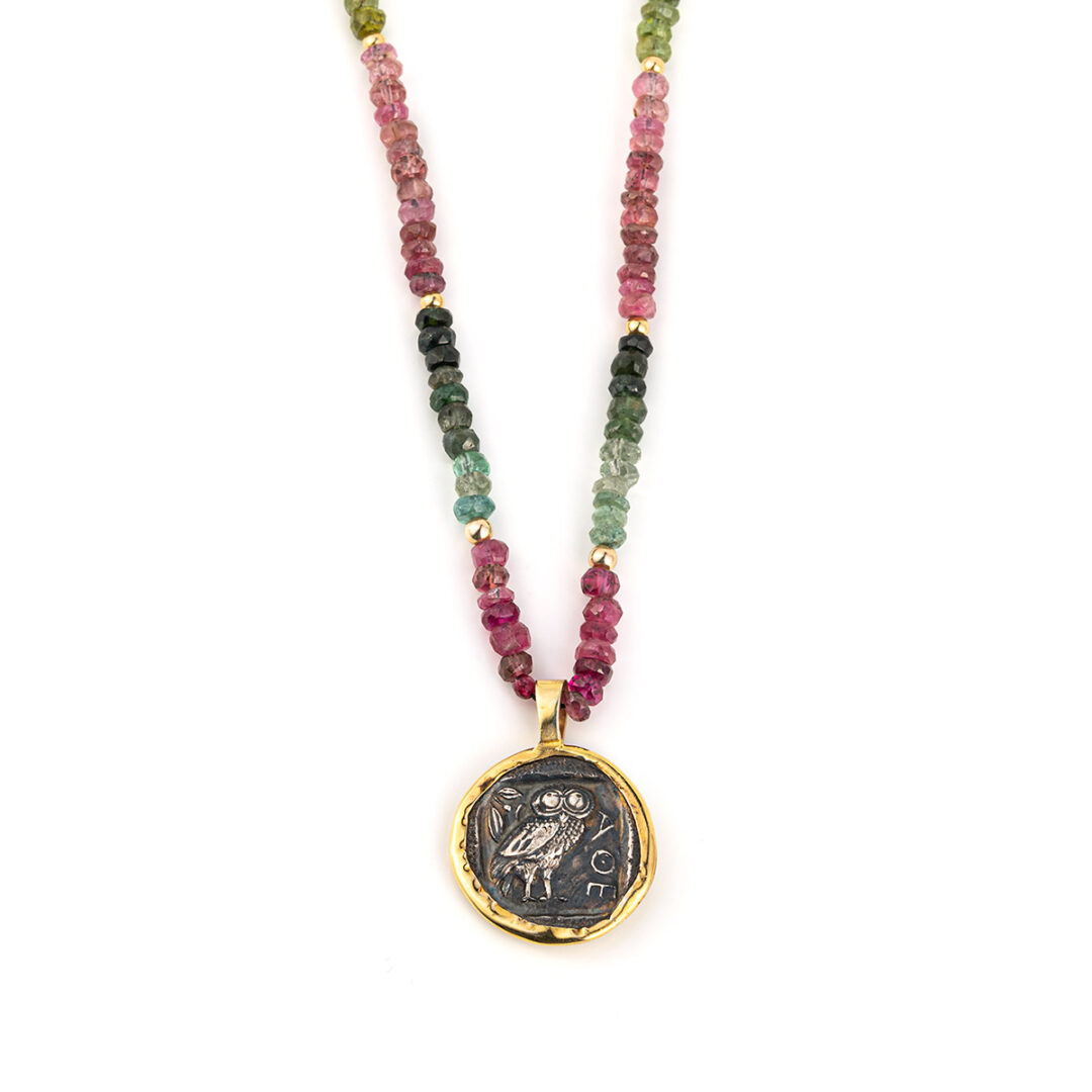 Athena Goddess Necklace – 14 K Gold and Sterling Silver with Tourmalines