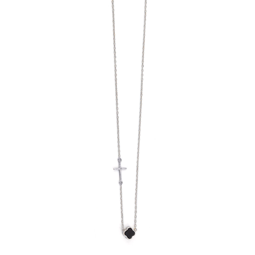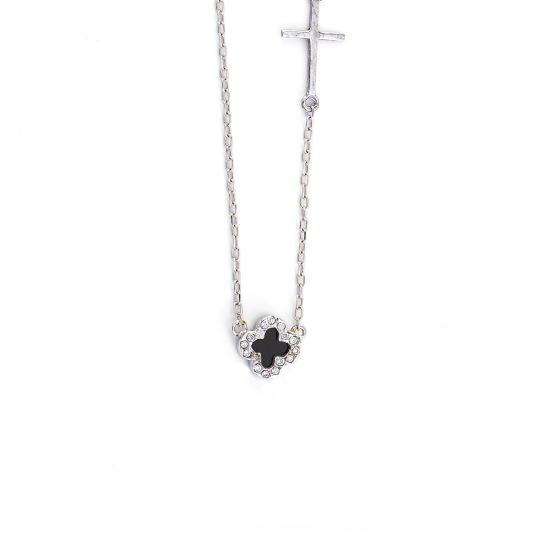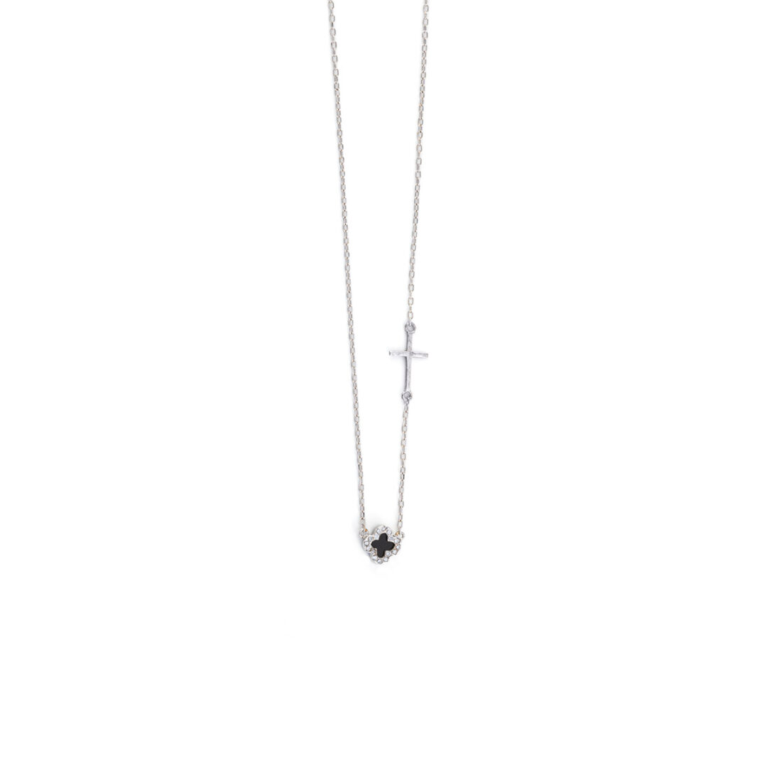 Black Onyx Cross necklace in white gold 14k, adorned with white zircon stones.