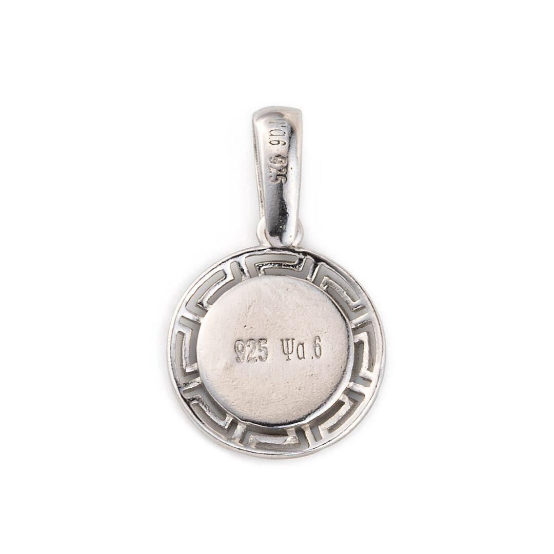A sterling silver pendant featuring the meander symbol with a blue opal stone.