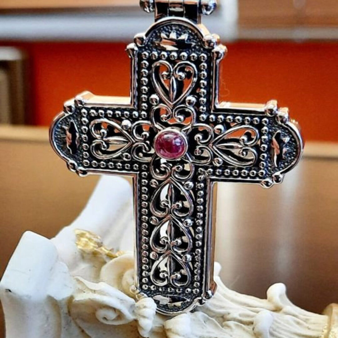 It has a Byzantine design and the center of it is decorated with a natural precious stone.