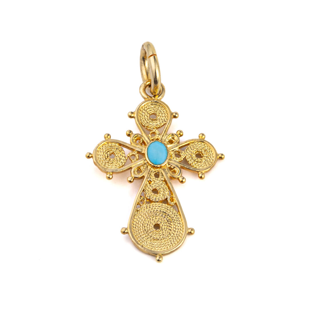 A gold Byzantine filigree cross embellished with turquoise enamel is a stunning piece of jewelry with a rich history and intricate design.