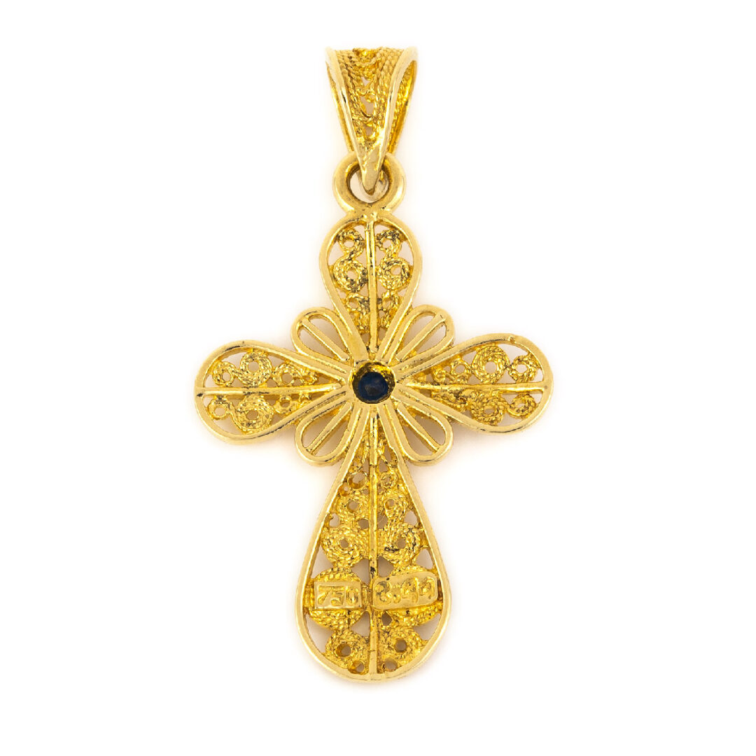 Byzantine Cross embellished with a fine filigree and a sapphire gemstone in the middle.