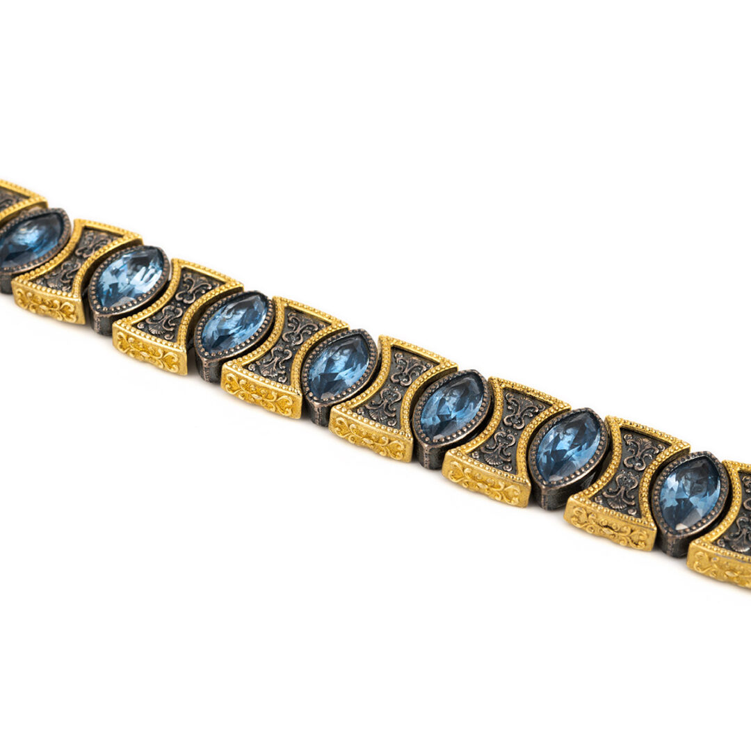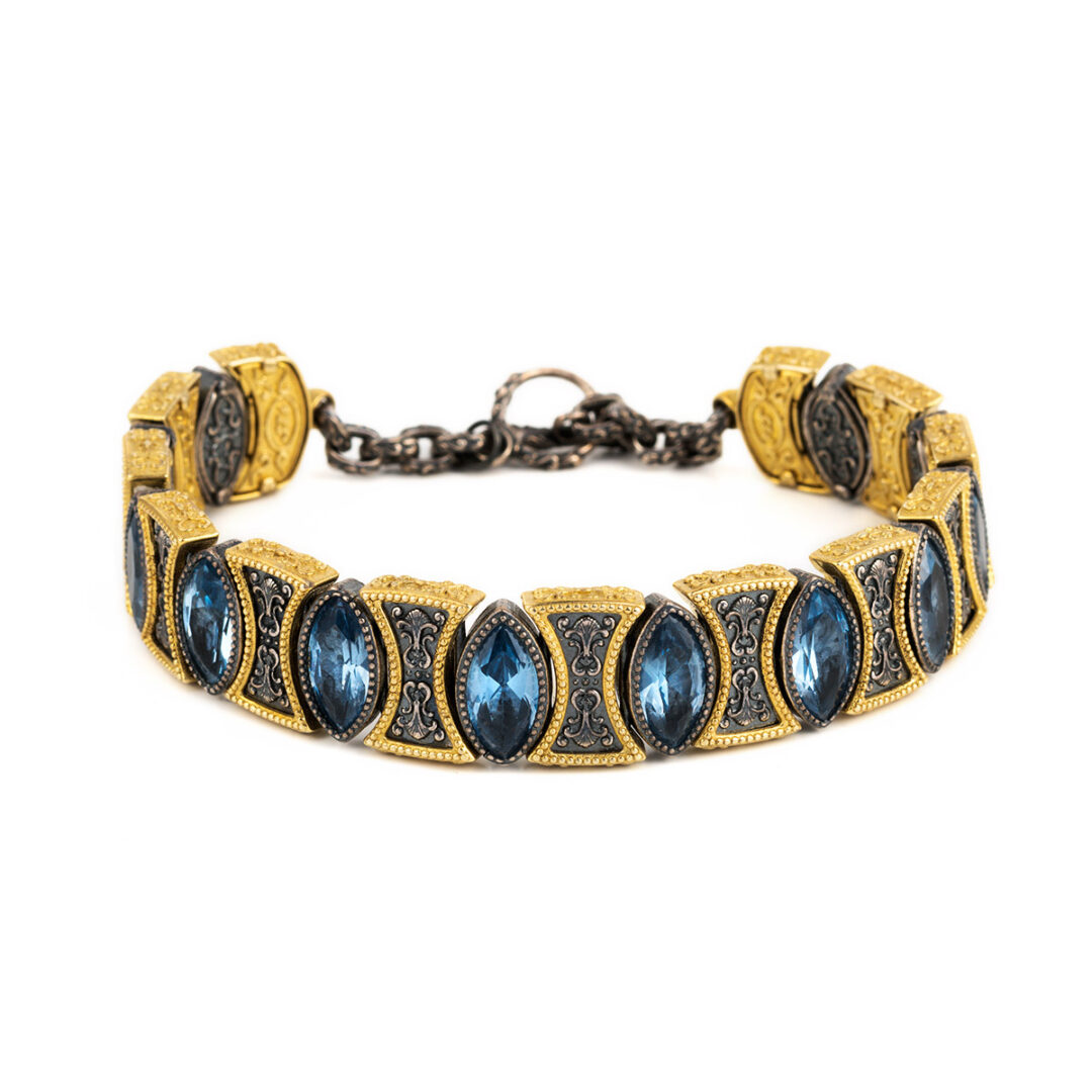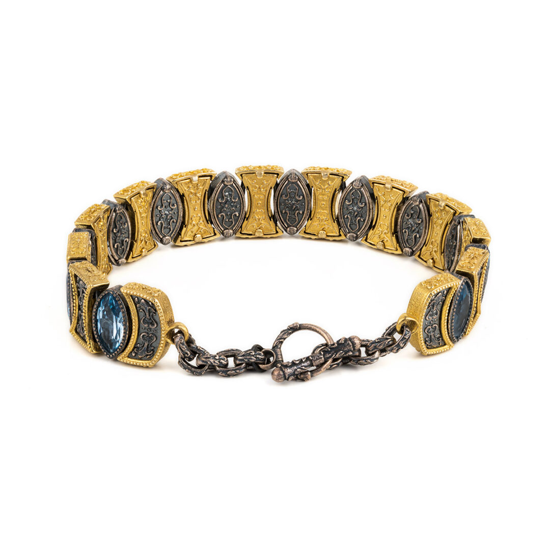 This bracelet is inspired by Byzantine Historical period respecting Greek traditional art. A unique and elegant bracelet made in 925⁰ sterling silver and gold plated, decorated with precious stones. Τhis bracelet was designed to show the glamor of the Byzantine era.