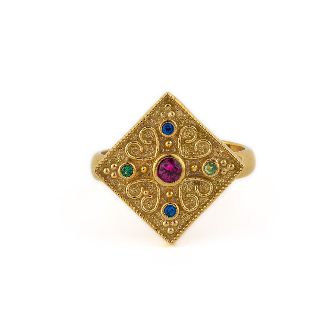 [vc_row][vc_column][vc_column_text css=”” woodmart_inline=”no” text_larger=”no”]Byzantine Rhombus Ring Multicolor – 925 Sterling Silver and Gold Plated