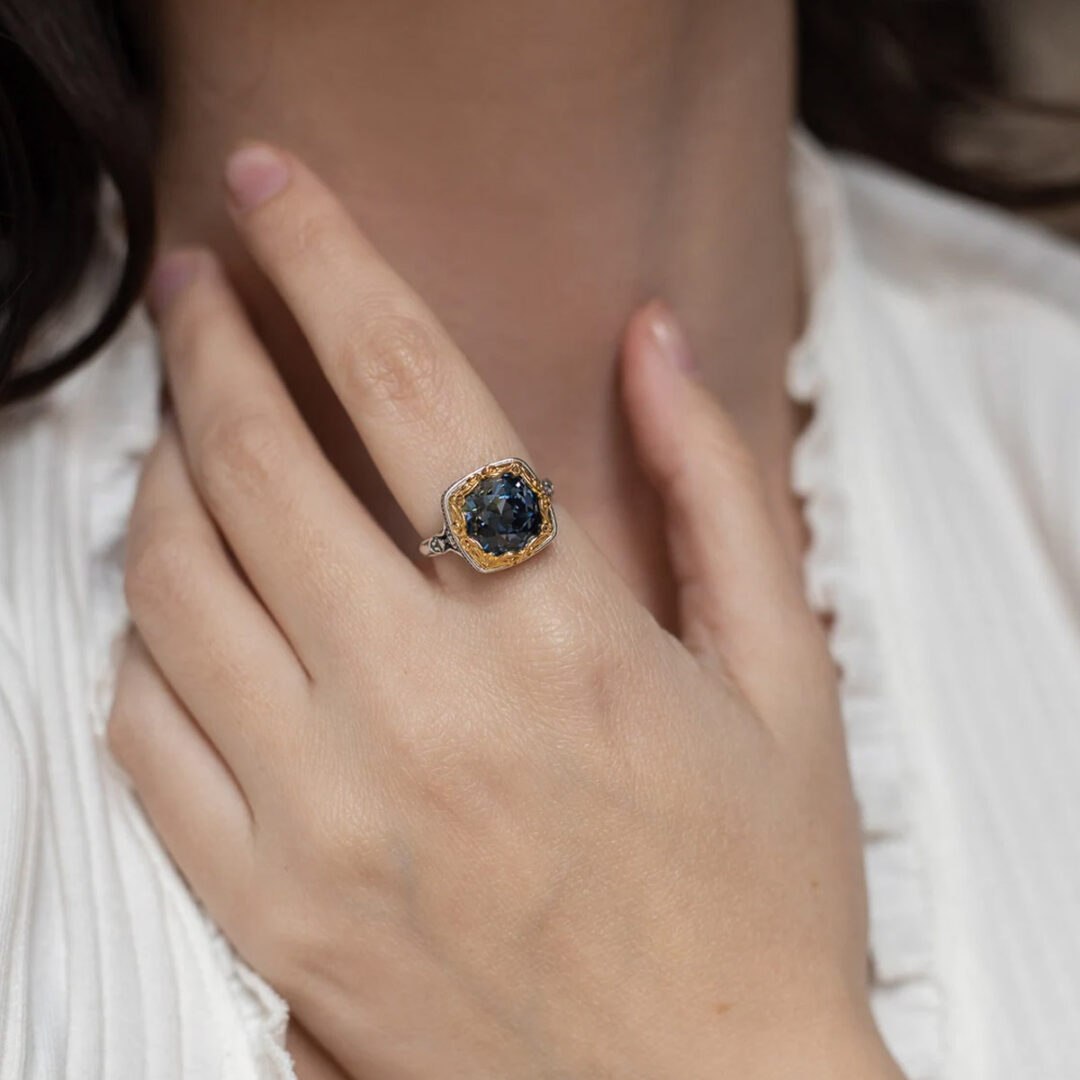 Byzantine ring with blue opal swarovski 1cm cushion. Made of 925⁰ sterling silver with gold plated part.