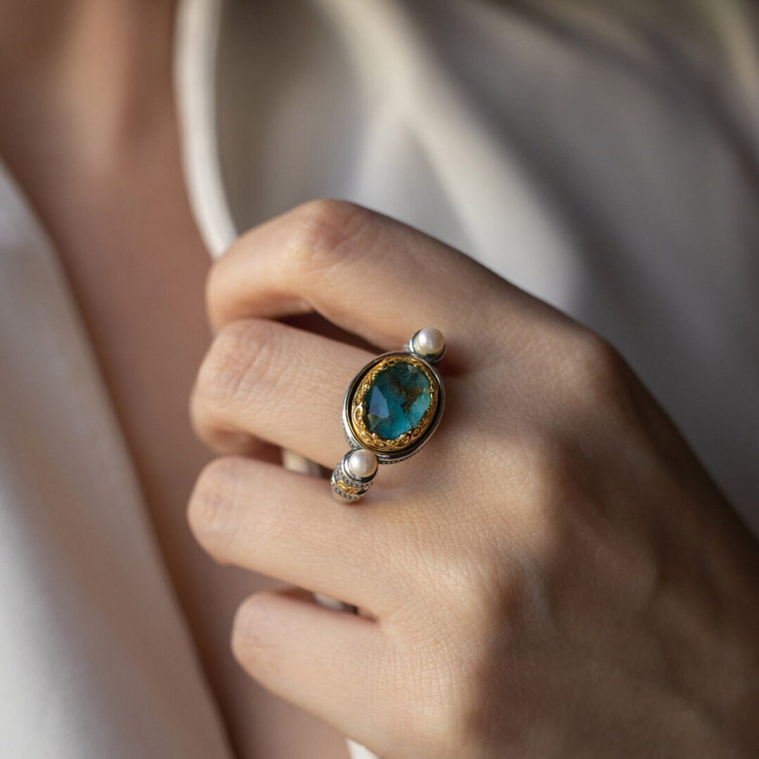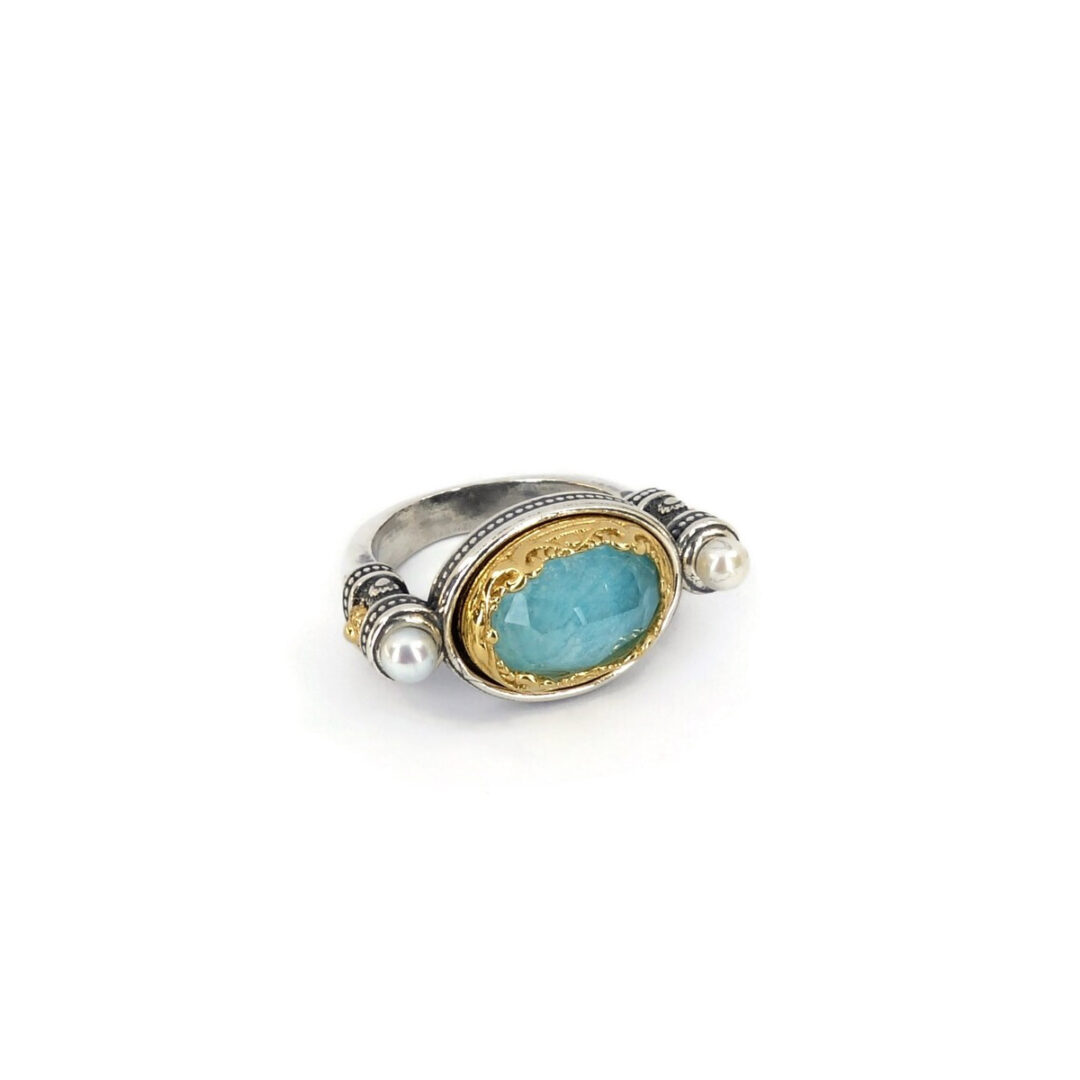 Byzantine ring with doublet amazonite 1cmX1.4cm oval and natural pearl gemstone.