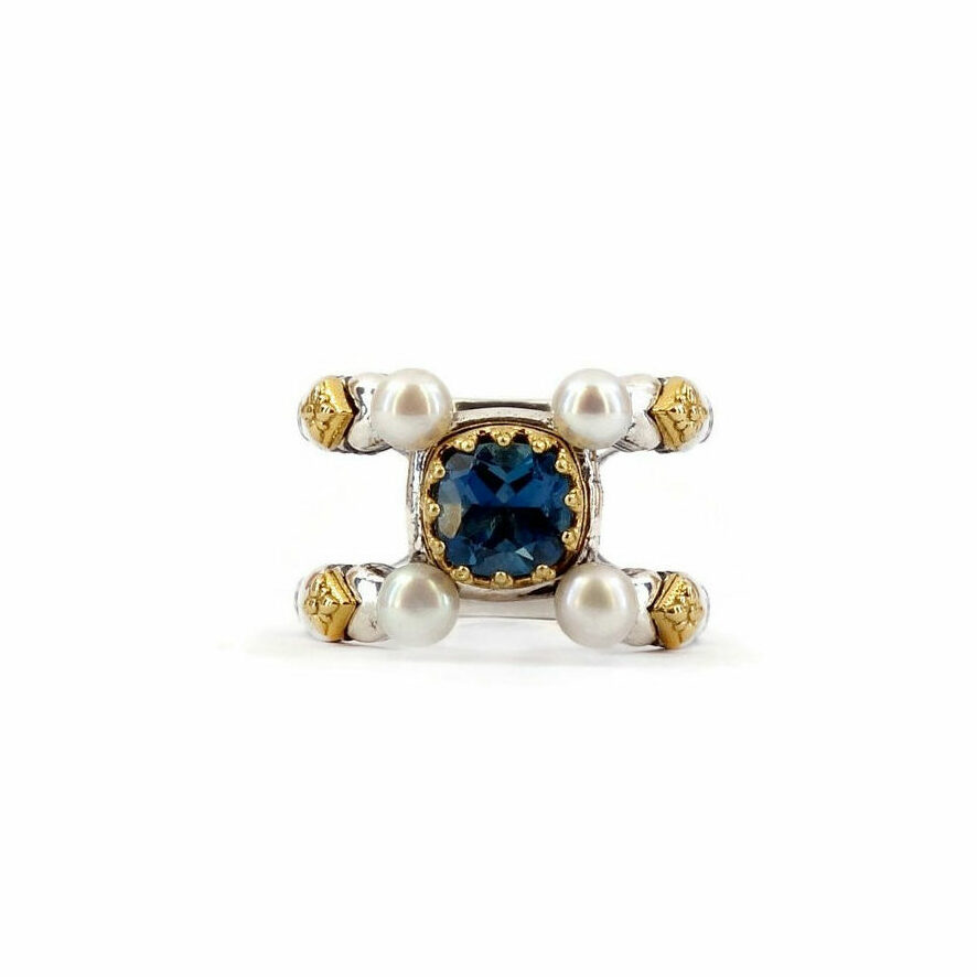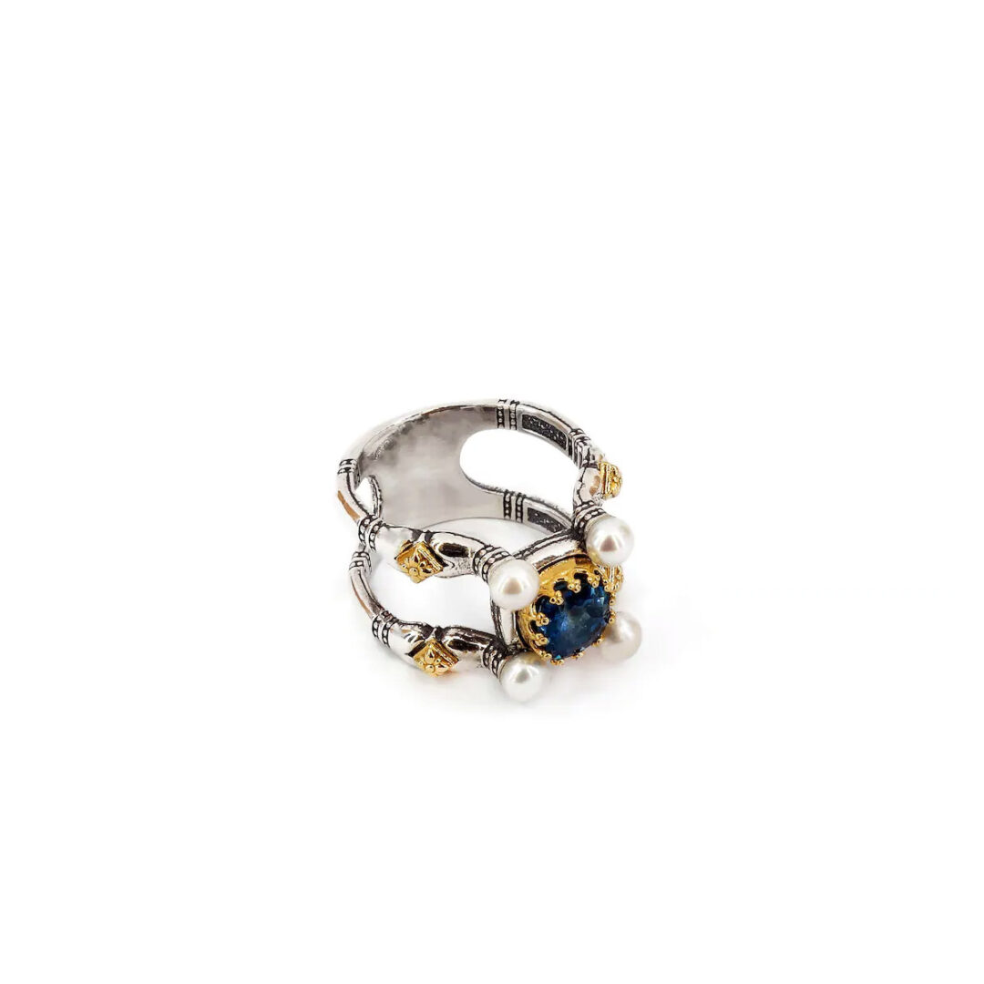 Byzantine Ring with Natural London Blue Topaz Gemstone and Pearl
