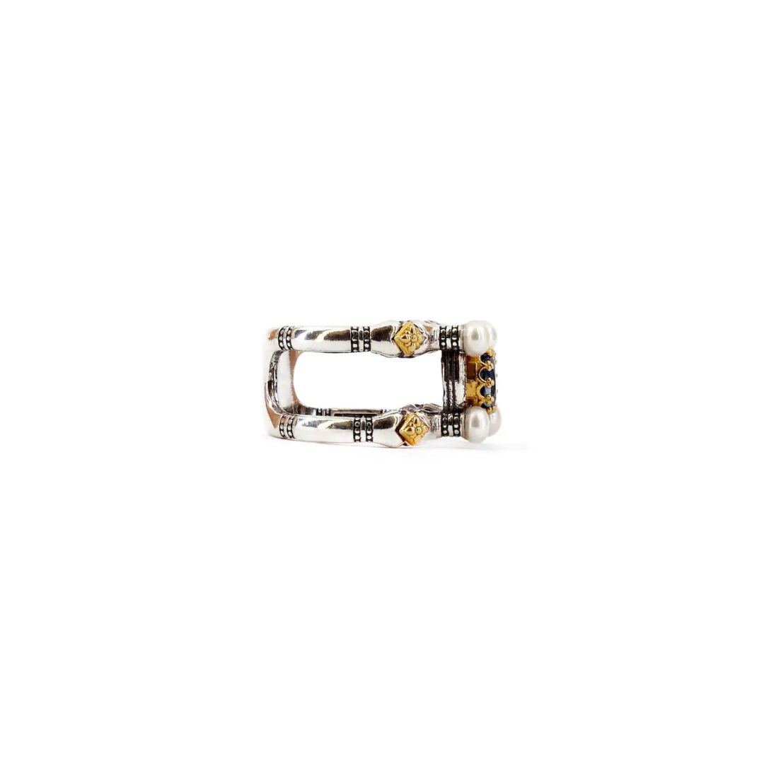 Byzantine ring with natural london blue topaz 0,6cm cushion and Natural pearl gemstone.