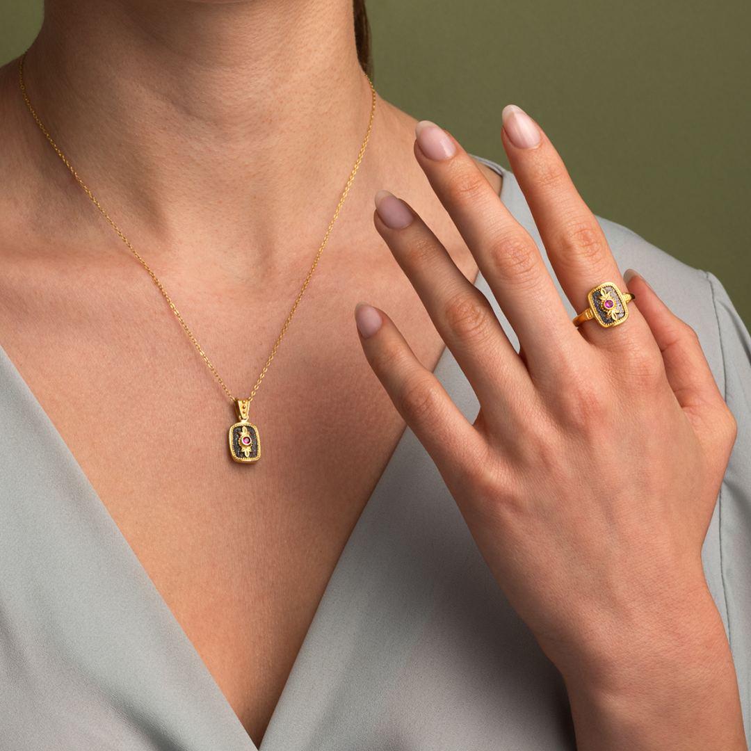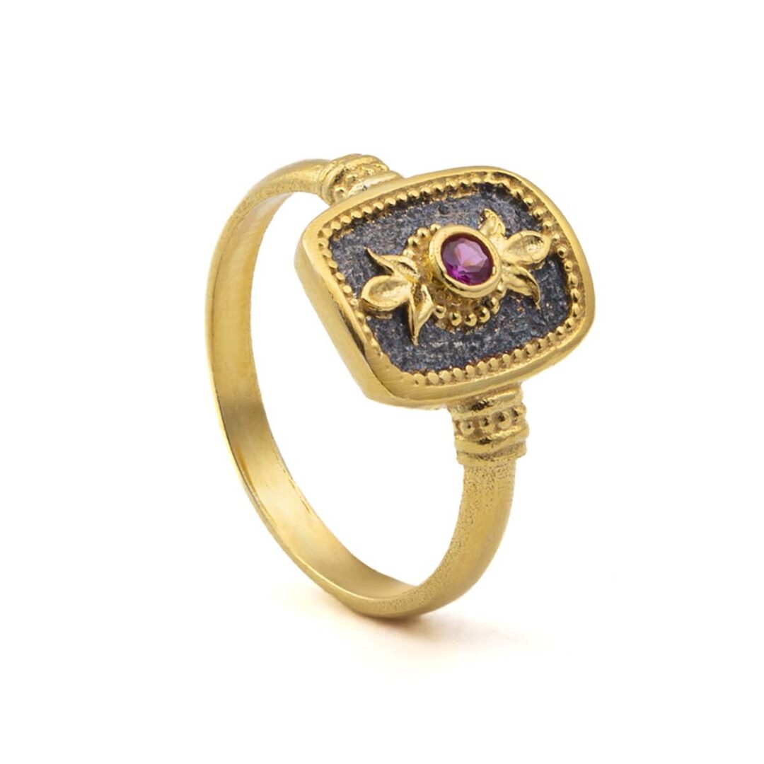 Byzantine Square Ring with Red Zircon – Sterling Silver and 18K Gold Plating