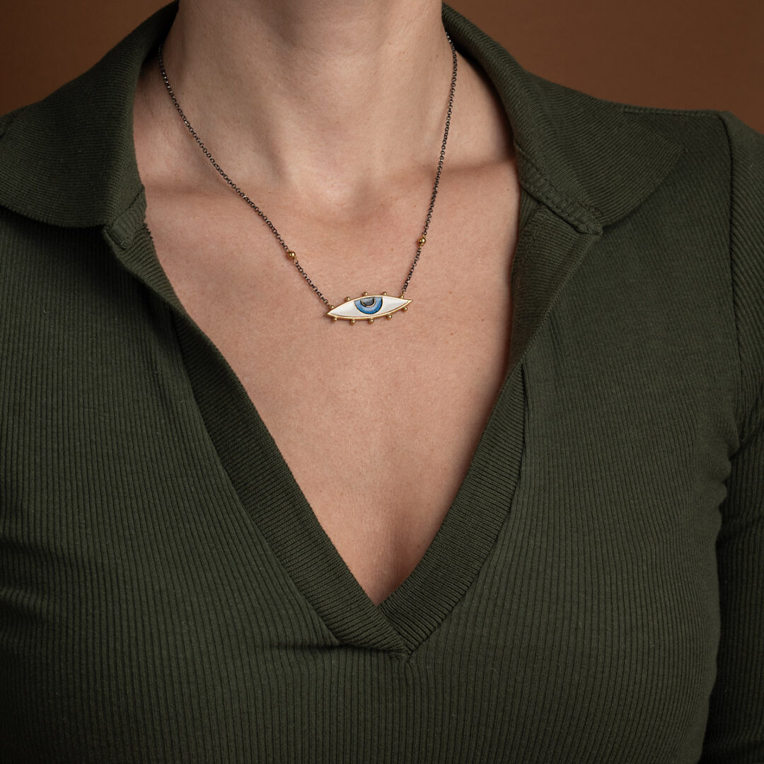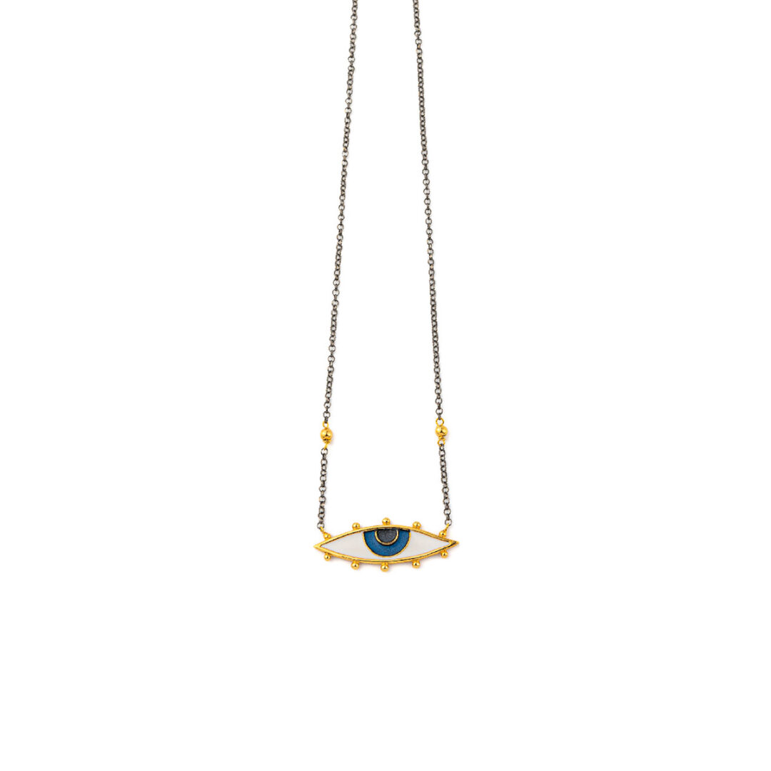 Sterling silver and gold plated chain necklace with enamel eye and beads.