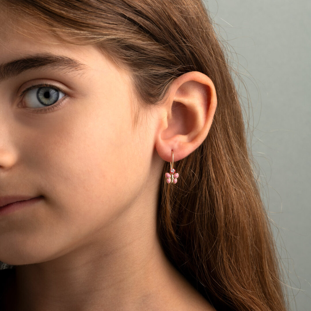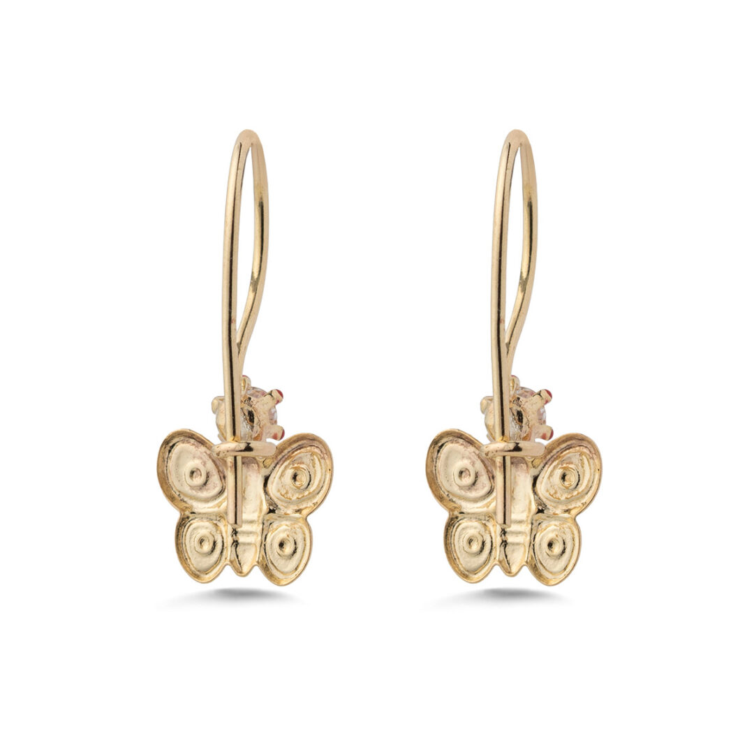 Adorable 9K gold butterfly dangle earrings for girls, featuring pink enamel and a sparkling zircon stone, a sweet and colorful jewelry gift for little ones.