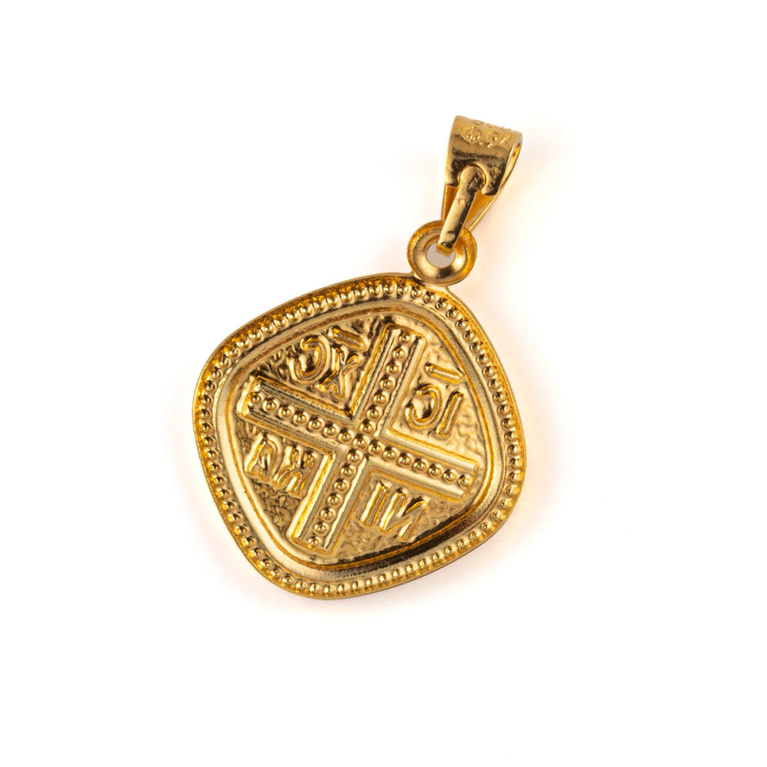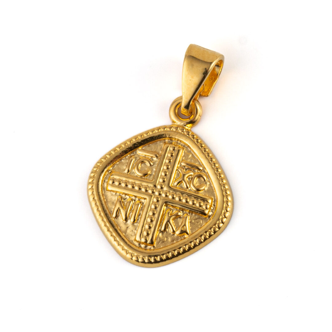 A handmade gold pendant that depicts Christogram with the initials IC XC NIKA (Jesus Christ conquers).