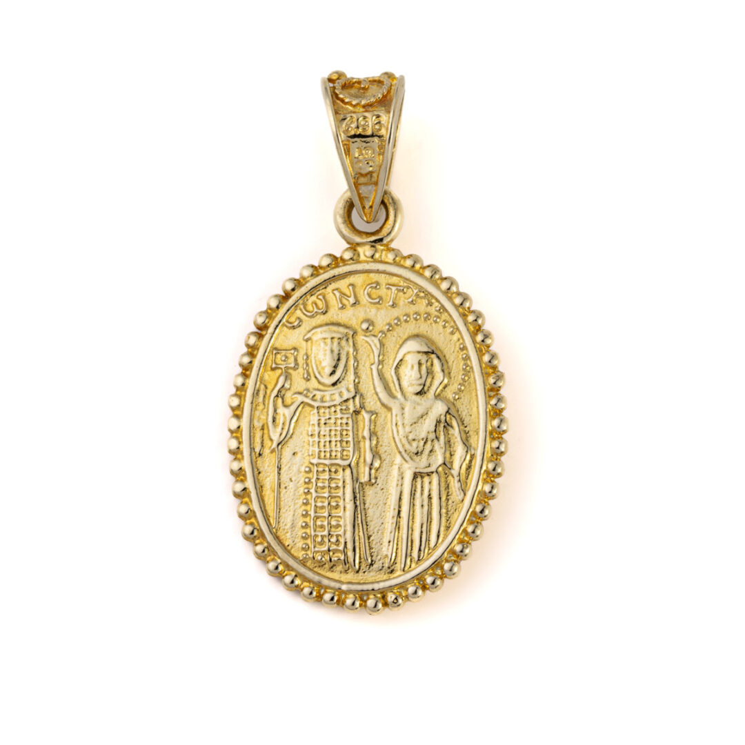 A handmade gold Constantinato pendant that depicts a cross on the one side and Saints Constantine and Helena on the other side.