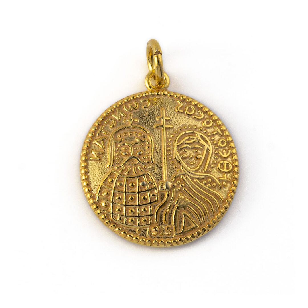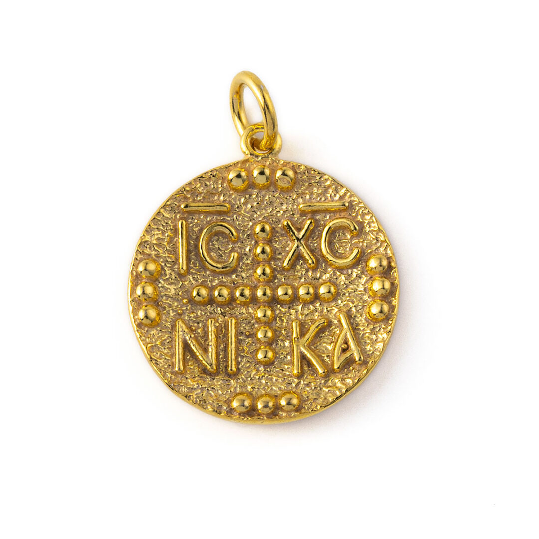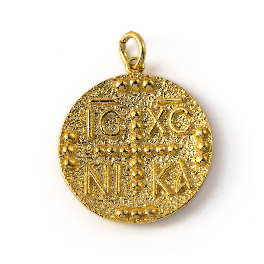 A handmade pendant that depicts Saints Constantine and Helena on the one side and a Cross and Christogram with the initials IC XC NIKA (Jesus Christ conquers) on the other side.