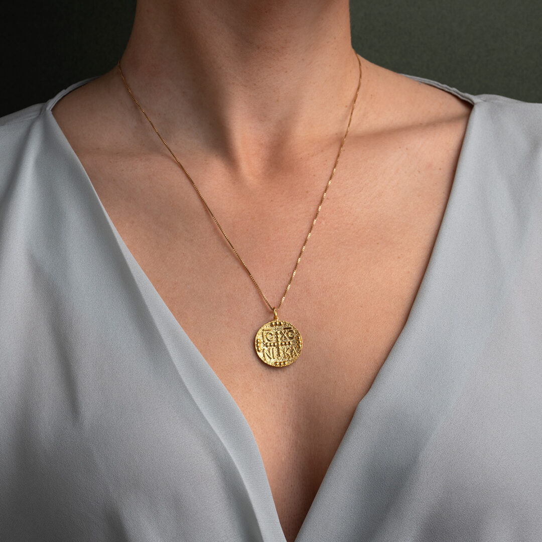 A handmade pendant that depicts Saints Constantine and Helena on the one side and Christogram with the initials IC XC NIKA (Jesus Christ conquers) on the other side.