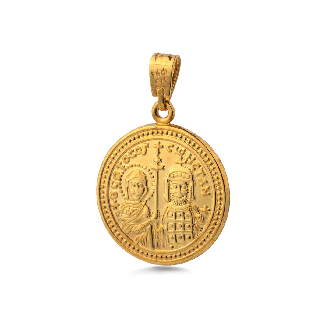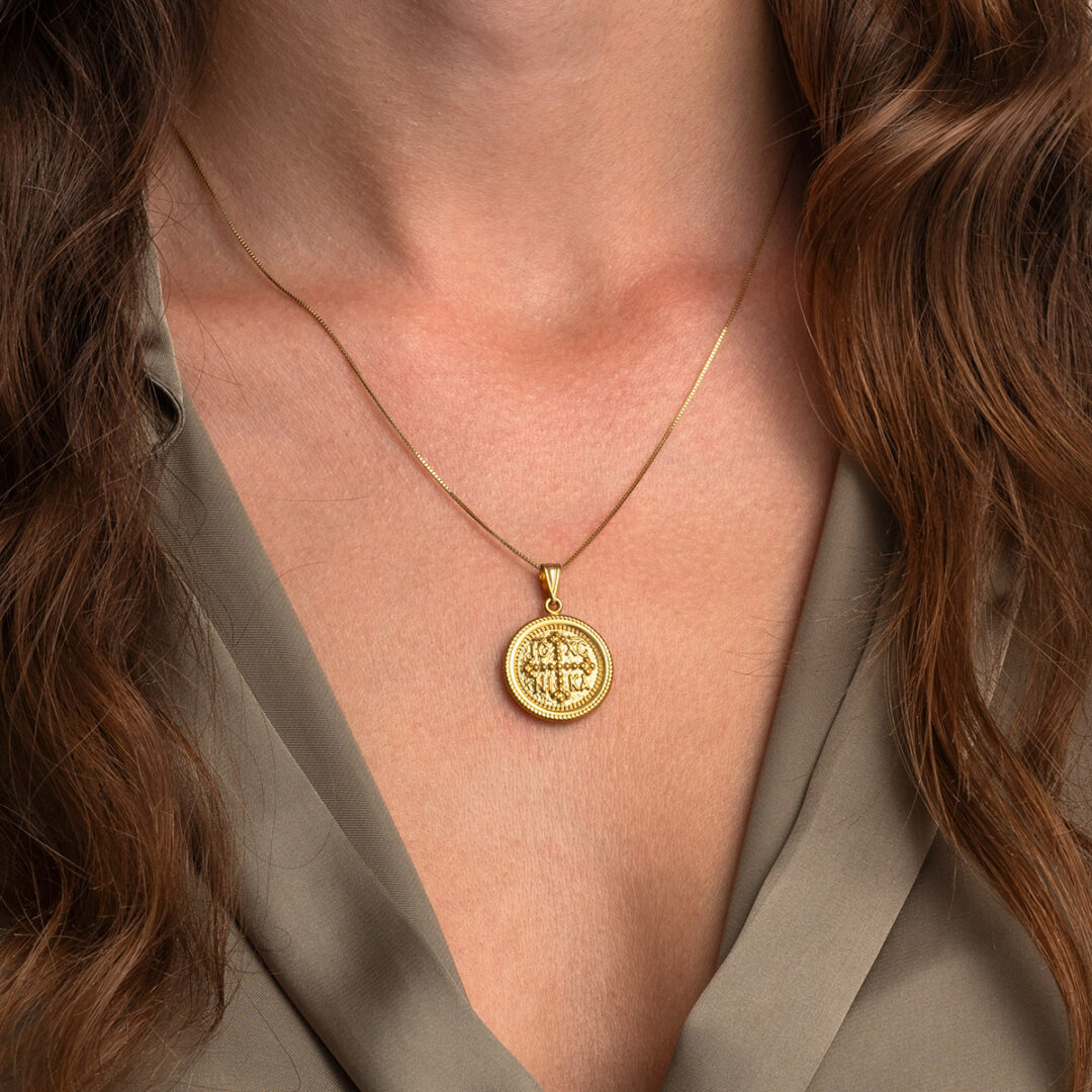 A handmade gold pendant that depicts Christogram with the initials IC XC NIKA (Jesus Christ conquers).