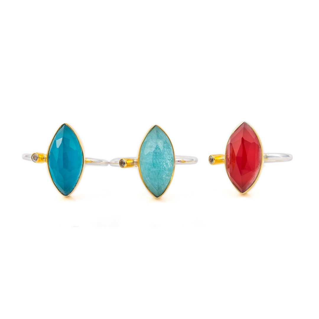 Doublet jewelry is a very special piece of jewel due to the way it is compounded. Doublet is a modern and very fashionable design that was invented in order to make stones such as lapis lazuli, turquoise and other non-transparent stones glow and create unique colors from them. There is the unification of two gemstones, which usually consist of quartz and another nontransparent stone. Quartz in this case gives radiance to the other stone and also volume. Due to its composition doublet jewelry needs to be looked after. To keep them in good shape you need to avoid contact with chemicals, such as soap or perfumes. Quartz has the tendency to lose its shininess when touched with sweaty hands, we advise you from time to time to use a soft cloth to polish and give brightness to it.