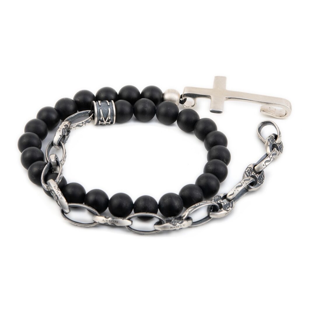 Black Bracelet: Sterling silver double wrap bracelet with cross, chain and onyx matte beads